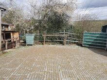 Es gibt einen matscharmen, mit Paddockplatten ausgelegten Offenstall mit