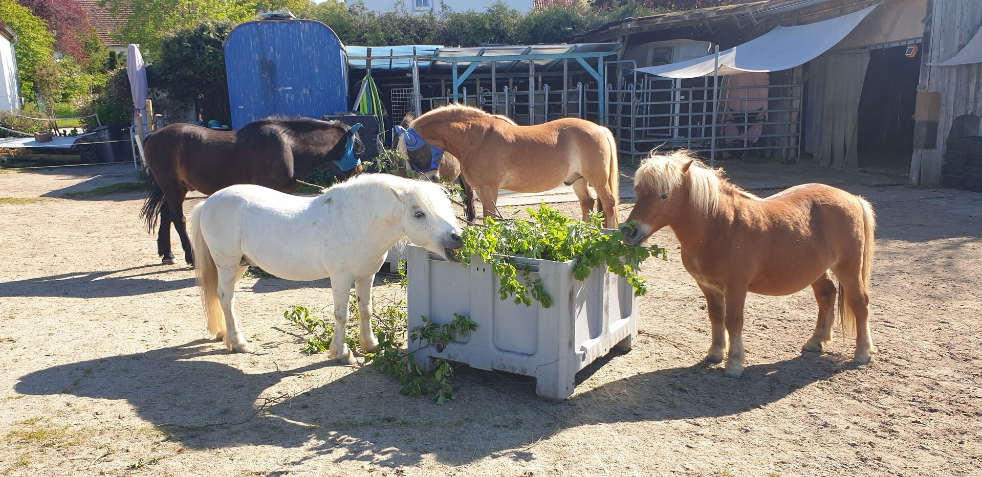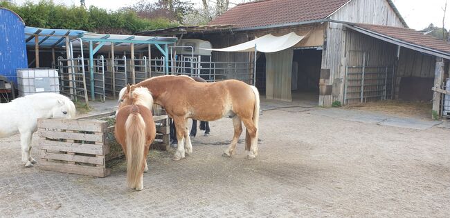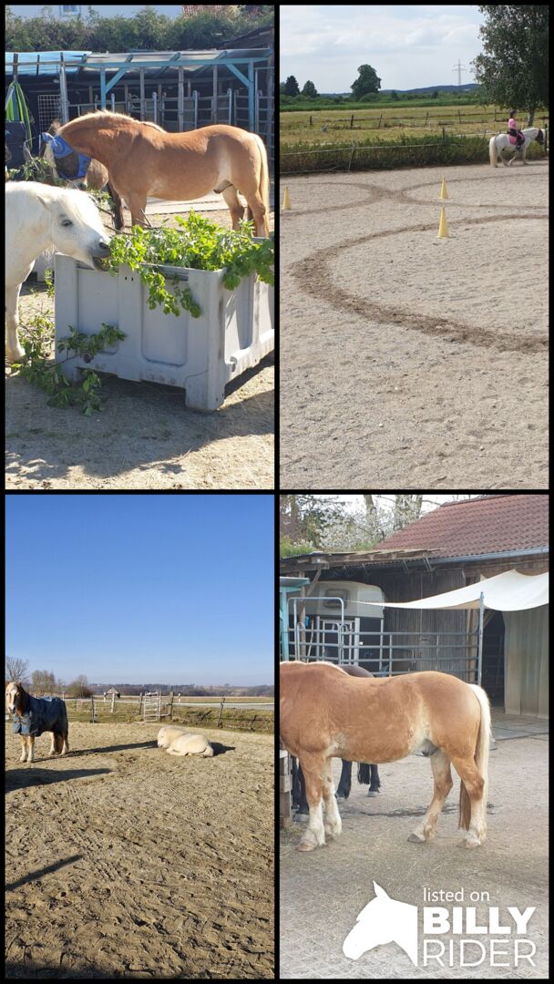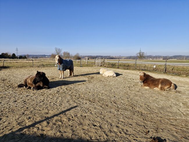 Offer open stable space for shetty/pony gelding/stallion - In my small, private open stable there is a place available for a lovely pony gelding (possibly also a social stallion) up to approx. 1.25m height. The ponies have permanent access to a paddock of approx. 800 square meters, which is paved with paddock slabs and therefore mud-free. Part of the area (approx. 20x22m) can be used as an exercise area and has a sand/woodchip surface. There are two shelters lined with rubber mats and covered hay feeding stands with hay 24/7. Depending on the season and weather, the paddock is used by the hour, so it is not suitable for 0-grass ponies. The current residents are between 19 and 29 years old (1x stallion, 3x geldings) but are still quite eager to move and play. We have a beautiful riding area and can even go swimming in the Amper nearby. Stable duties are divided up (at least 2x a week for approx. 45 minutes, more often if possible, full board not possible) and the price depends on the amount of help (from 180 euros). From Freising there is a continuous cycle path, bus stop 200m away.