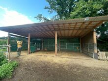 There are 2 shelters. The larger shelter is divided into 3 large boxes - one of the three is to be used as an emergency box/ grooming area. The ground in front of both shelters will be paved with paddock slabs or other stones.