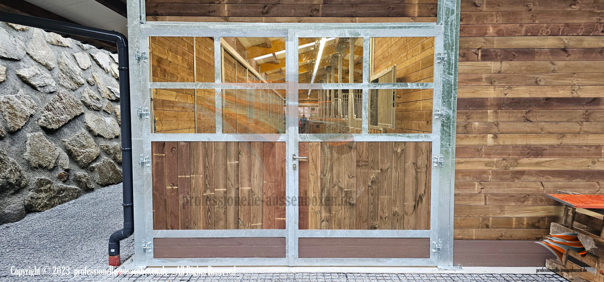 - Stable doors with separate door frame, reinforced hot-dip galvanized steel construction and laminated safety glass in the upper area