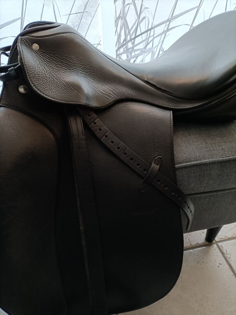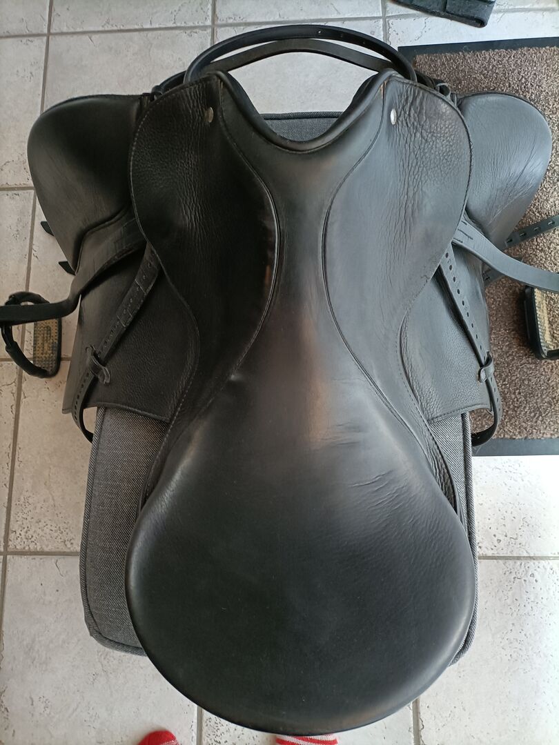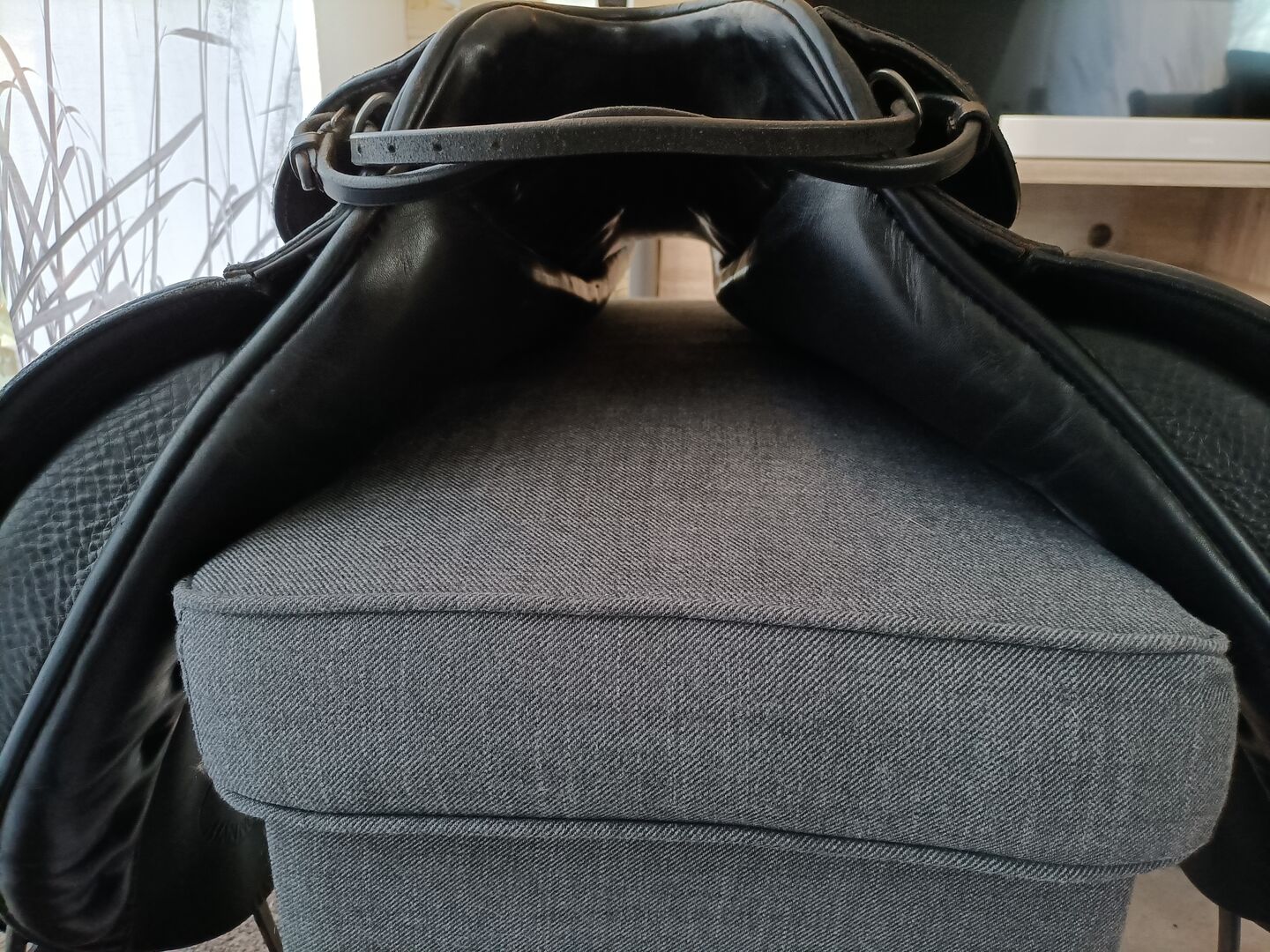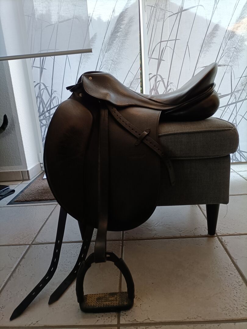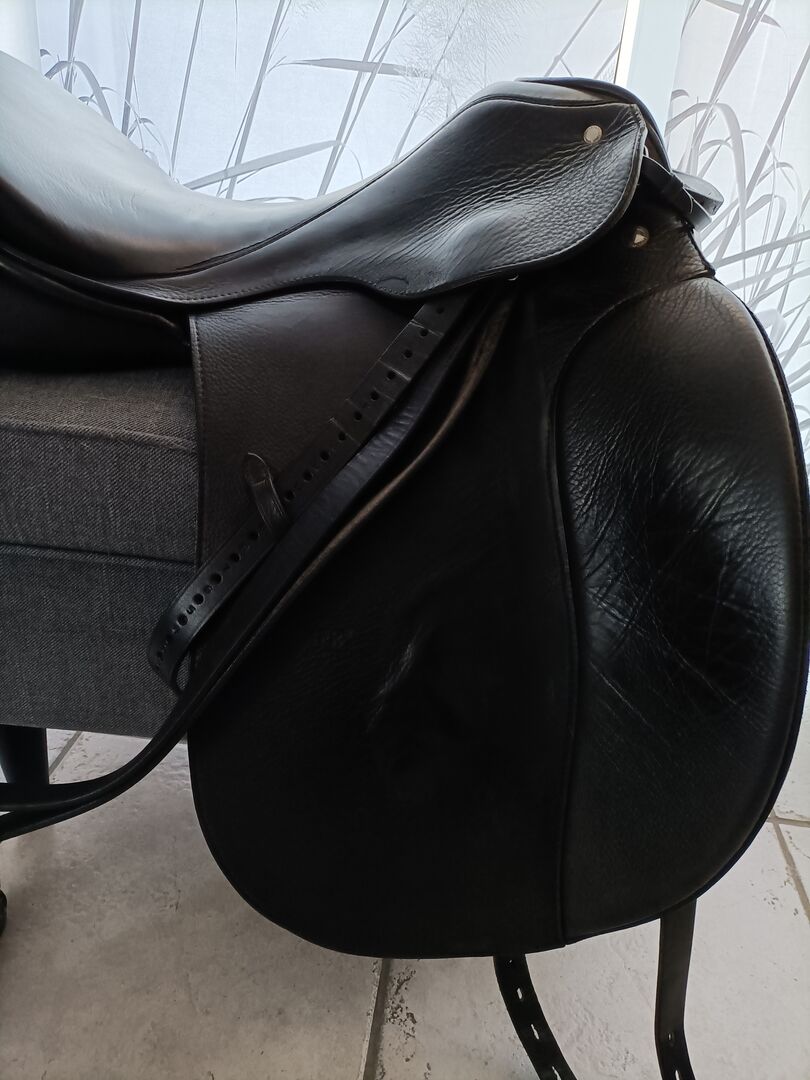 This saddle was developed for baroque horses (PRE, Lusitano, Haflinger,...) I myself rode my 1.70 m Westphalian for a long time with it. It was regularly checked by a saddler. The panel is soft padded and can be adjusted to the horse's back. The saddle has some signs of use.