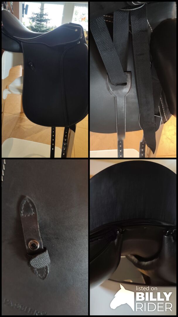 Passier Dressage Saddle Compact Comfort Seat size 2 - For sale as good as new, little used dressage saddle by Passier in seat size 2. It has only been on the horse a few times as we unfortunately no longer have it. The saddle is a custom-made saddle. The seams and seat piping are in champagne, a large large Swarovski topaz stone on the stirrup strap loop. The saddle has split panels for a continuous spinal canal at the rear (also very good for kissing spines) The rear panel wedge is raised for an extra deep seat. The front panel wedge is for greater support and protection of the trapezius. The saddle is in its original factory condition and did not need to be adjusted due to the short period of use. This saddle is a dream for horse and rider! Chamber width 27.5. Original price 4290 Euro.