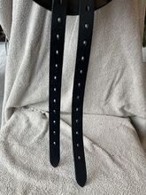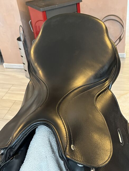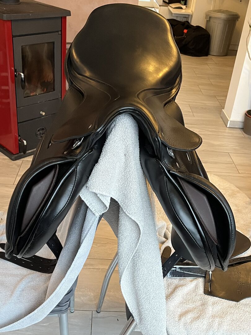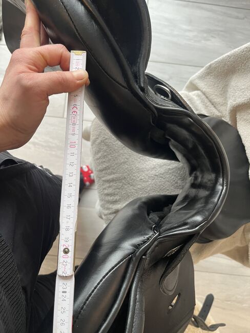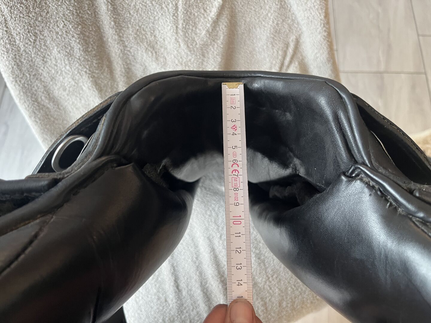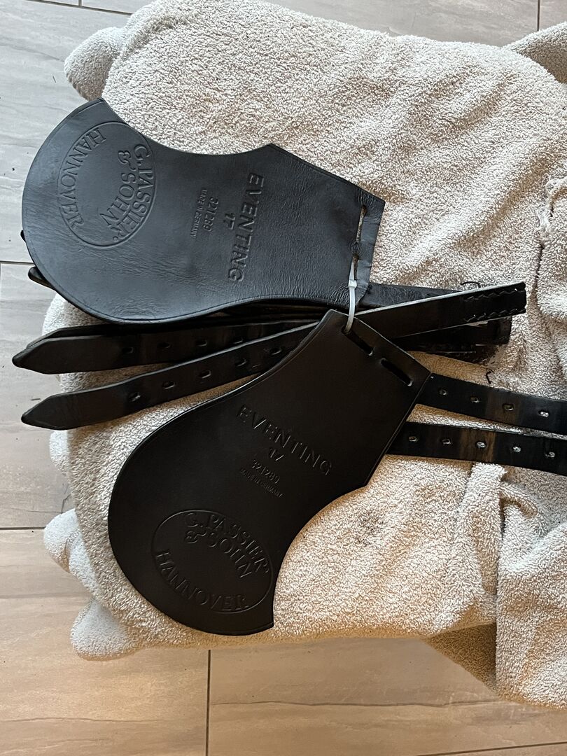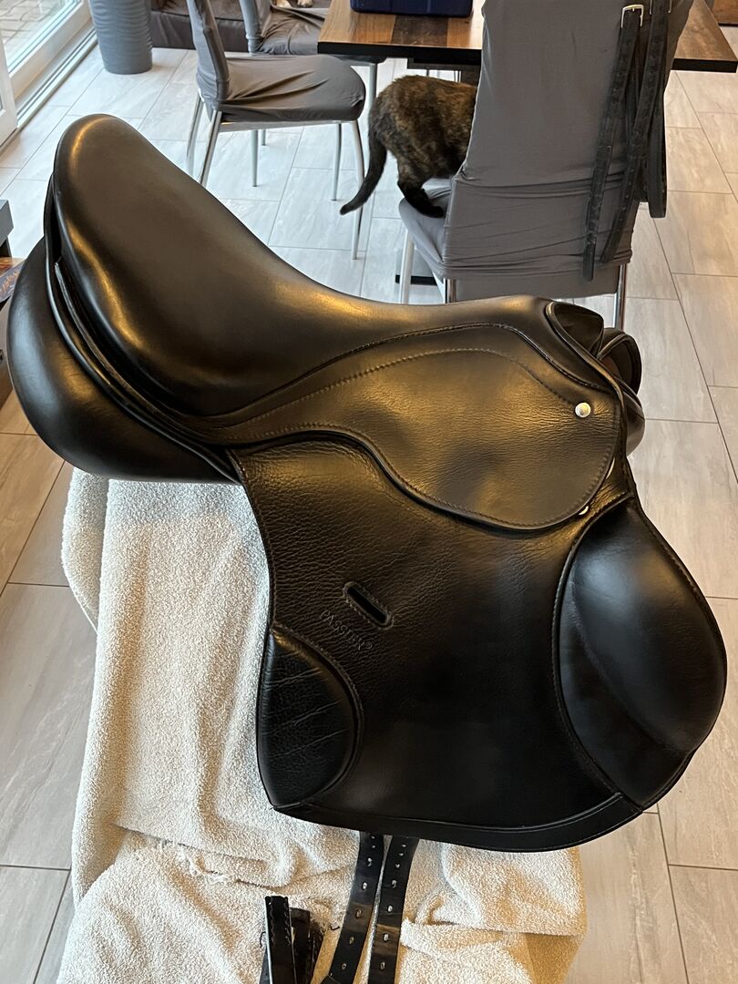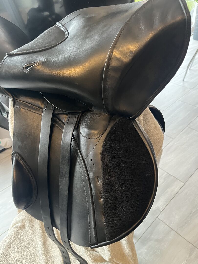 Passier eventig jumping saddle jumping saddle versatile black 17 33 32 34 velcro mono long shanks - ‼️2paar Klettpauschen‼️ If required with matching high-quality lambskin studs short girth from Mattes (new price 300€ ) Very well maintained Passier Eventing Fully doubled for extra grip, additionally equipped with an edge reinforcement ex works (not all models have this!) Very wide gullet channel to provide enough space for the spine. Plenty of freedom for the withers. The gullet plate is built in such a way that it offers the shoulder enough space. In addition, the panels are built in such a way that more volume can be padded in if necessary (many of these models have very little panel volume capacity). It is cold adjustable and thus "according to Passier" adaptable to many horse types. Many renewals are not even a year old! -Long girth straps to ride it with a short girth and to get more contact to the horse's body. (Old ones are included in case someone wants to have it rebuilt) -Fixed knee rolls replaced at the front to adjust the position and size of the knee rolls individually. 2 pairs included! small (brown) and large in black can be changed at any time and in two easy steps. -Wool completely replaced. -Year of construction June 2018, not year of use. Due to the large knee rolls and the doubled leather, you can only smile about a buck jump or a set to the side