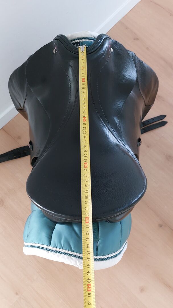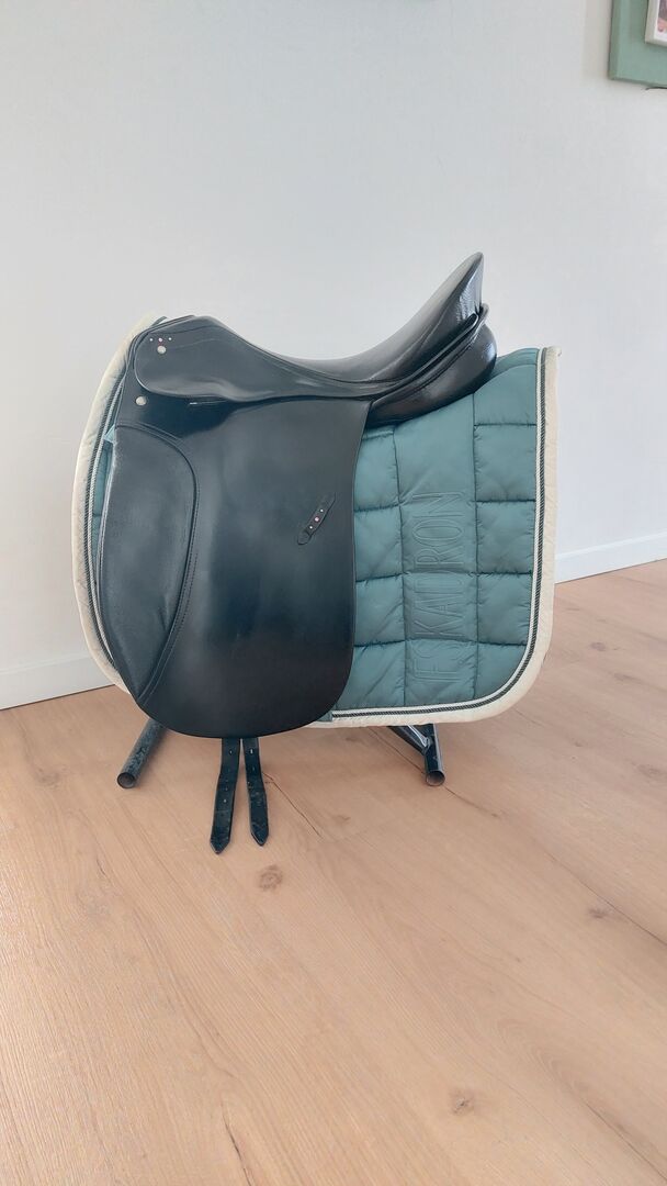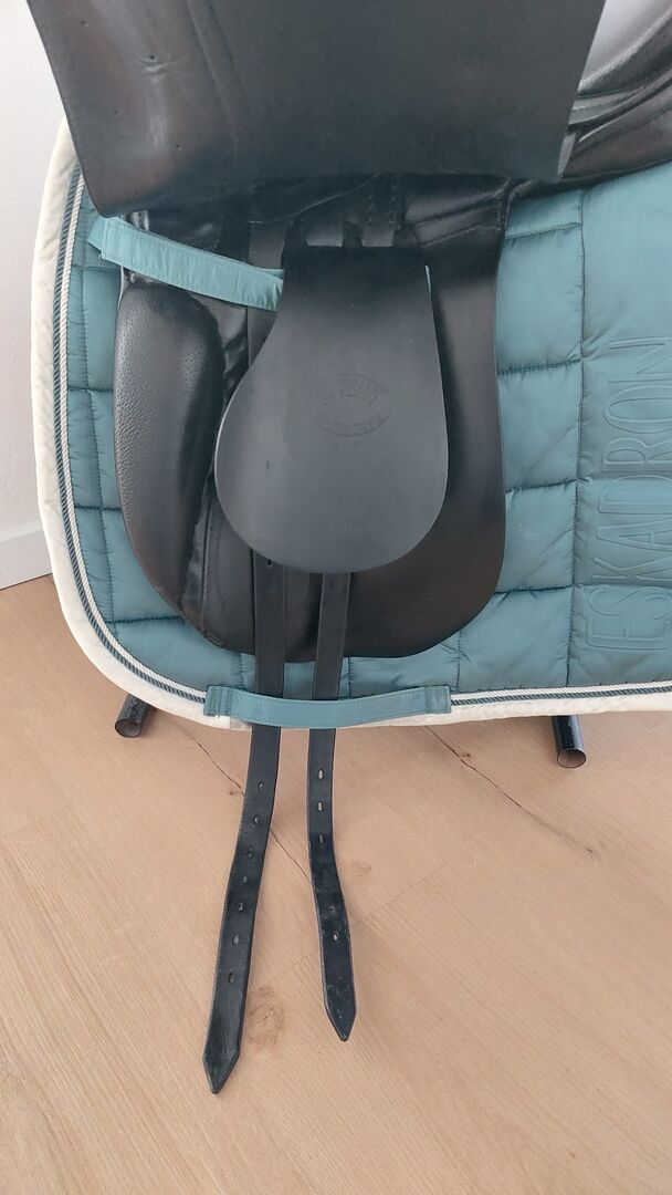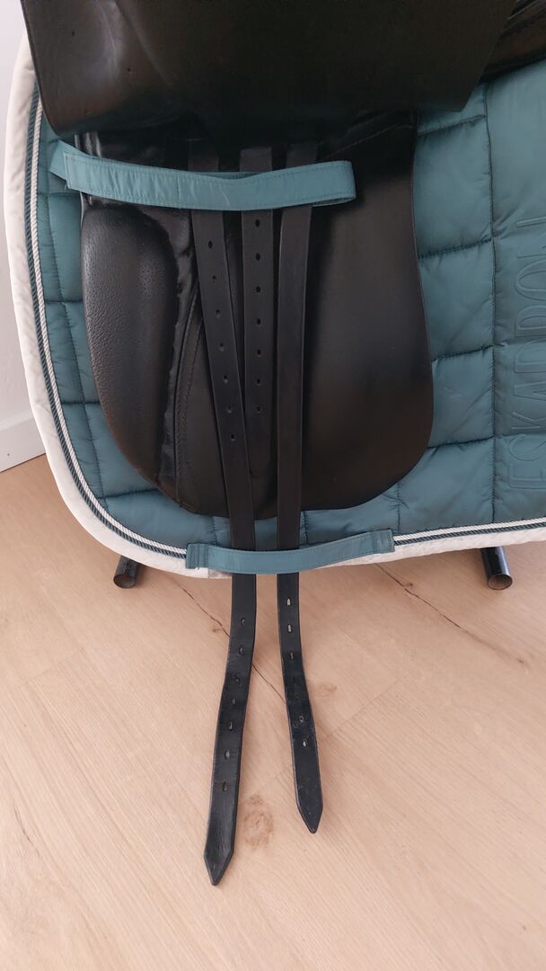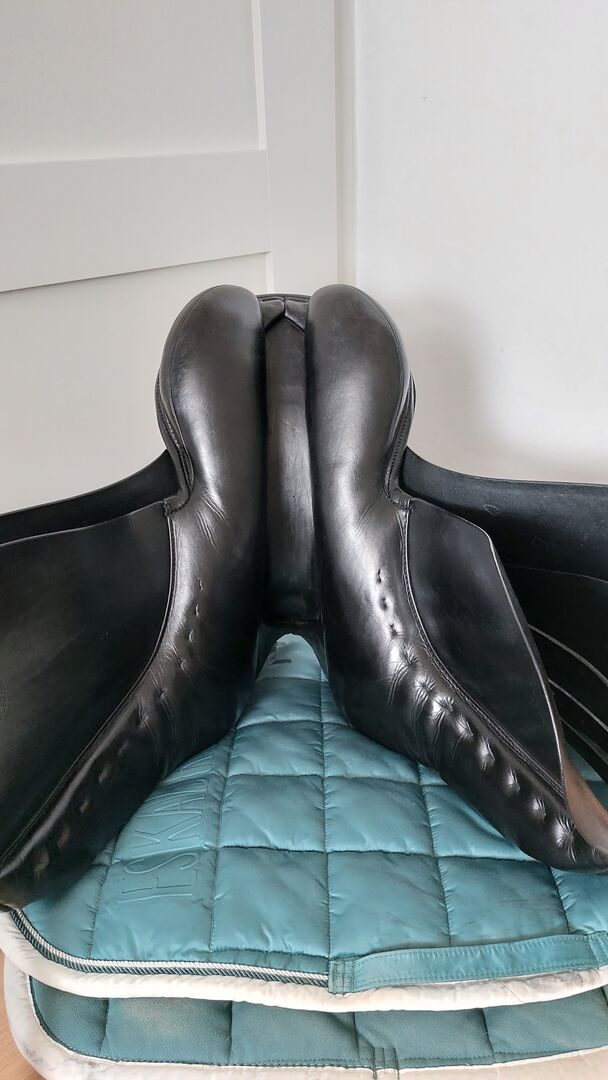 Made of black leather, deep seat that puts you close to and in the horse. Thanks to the well-positioned pommels, it supports the correct seat of the rider. The chamber is cut back in the front, so it can accommodate horses with more withers. I have always found the saddle to be very comfortable to sit in. The saddle has 3 girths (2x long ,1x short) so it can be ridden with a short dressage girth or even a long girth. I myself like to ride with long girth. The saddle is used, shows signs of use accordingly. I have tried to show it from all perspectives. It has no patches, open seams, waves in the seat....