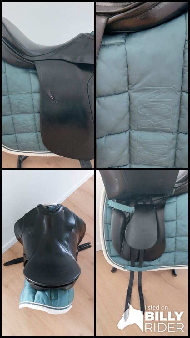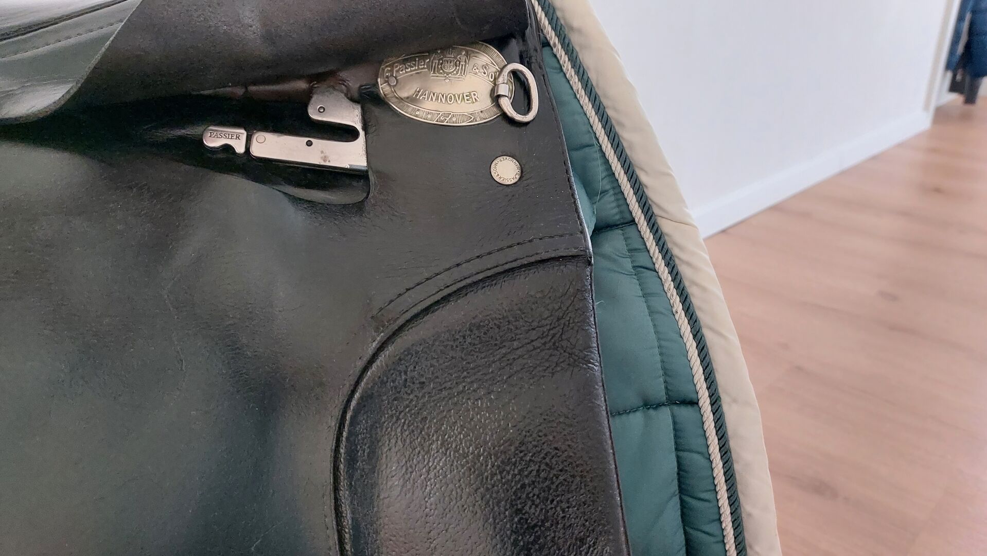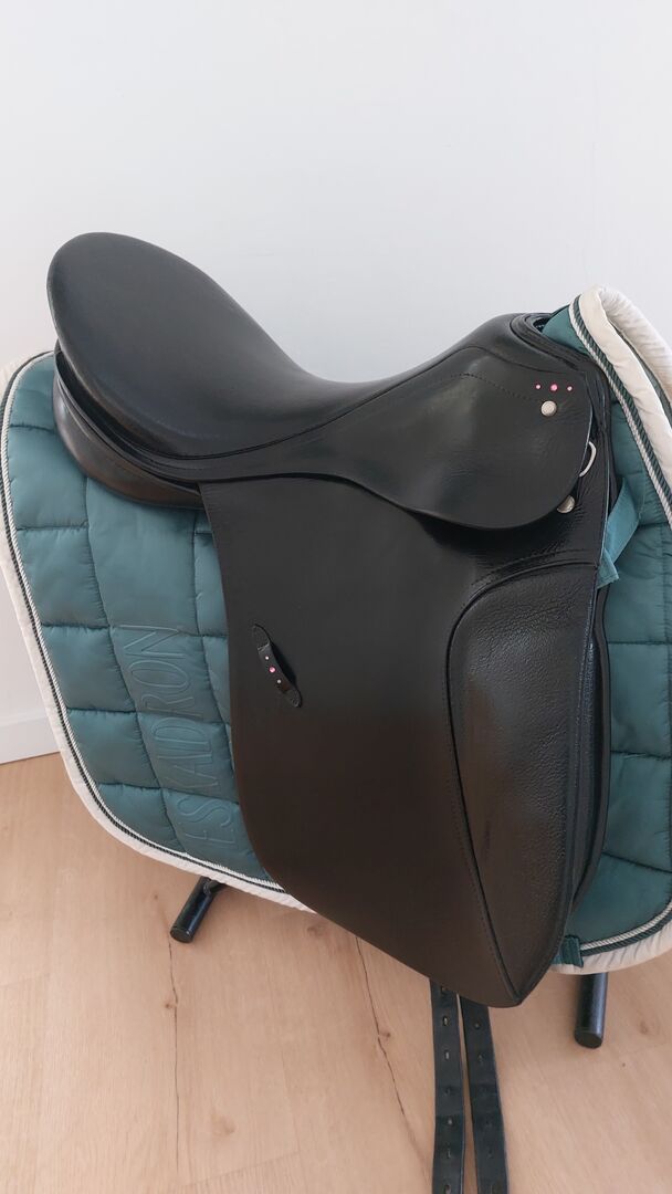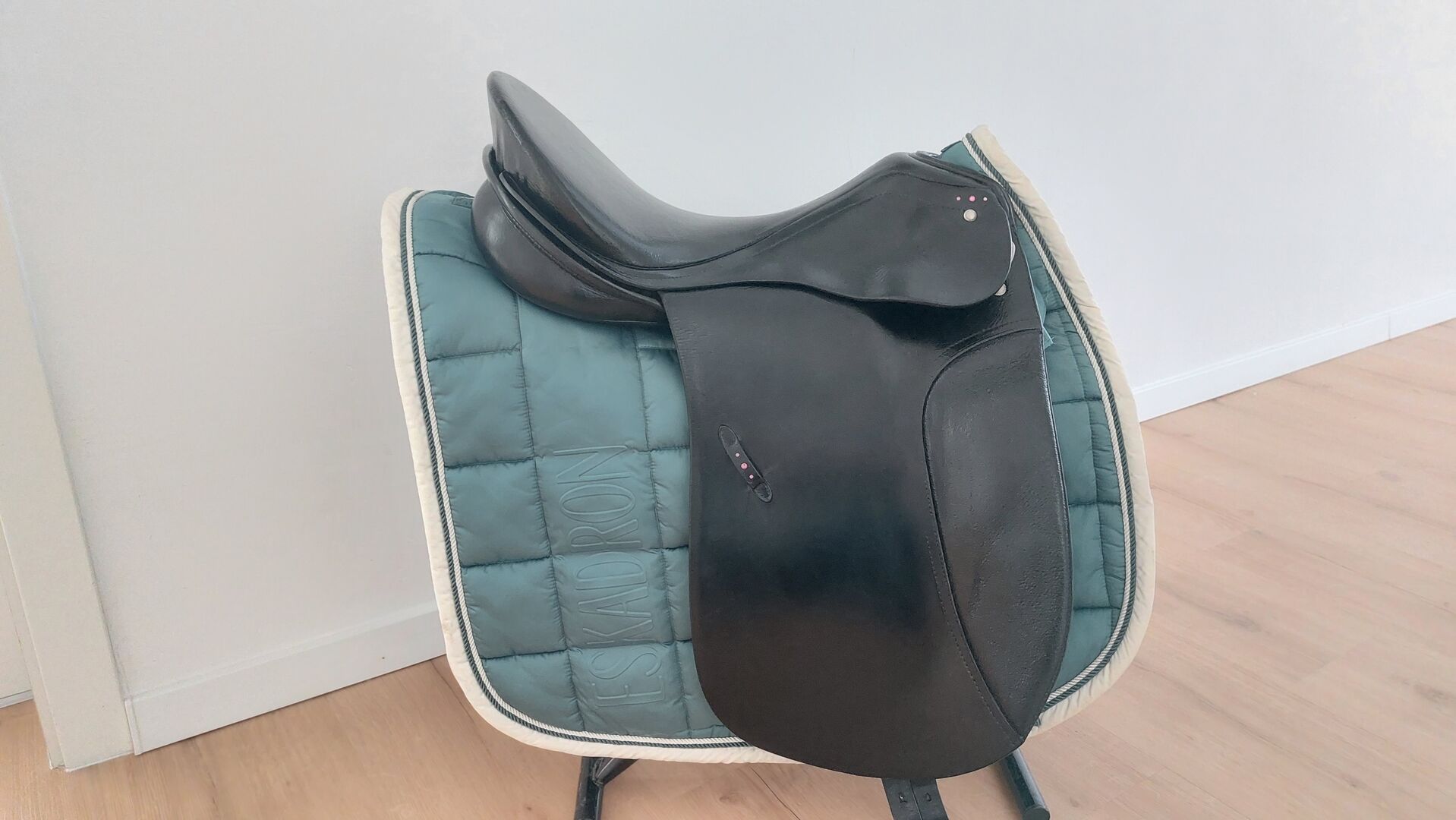 Made of black leather, deep seat that puts you close to and in the horse. Thanks to the well-positioned pommels, it supports the correct seat of the rider. The chamber is cut back in the front, so it can accommodate horses with more withers. I have always found the saddle to be very comfortable to sit in. The saddle has 3 girths (2x long ,1x short) so it can be ridden with a short dressage girth or even a long girth. I myself like to ride with long girth. The saddle is used, shows signs of use accordingly. I have tried to show it from all perspectives. It has no patches, open seams, waves in the seat....