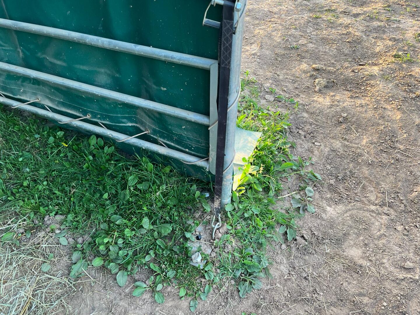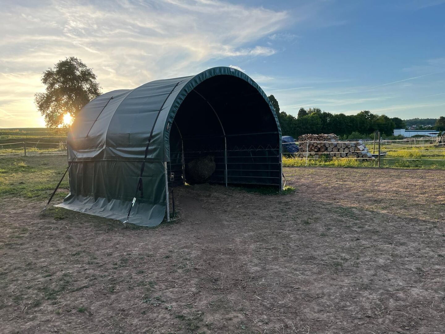 Pasture tent 4x4m - Offer as good as new pasture tent from Toolporth, 4x4m pasture tent, PVC tarpaulin, dark green, earth fastening Professional Stable and weatherproof shelter for resting and feeding Durable round arch construction Easy to erect thanks to the practical plug-and-screw system Very tear-resistant and waterproof PVC tarpaulin 2300 N (NP 1699€)