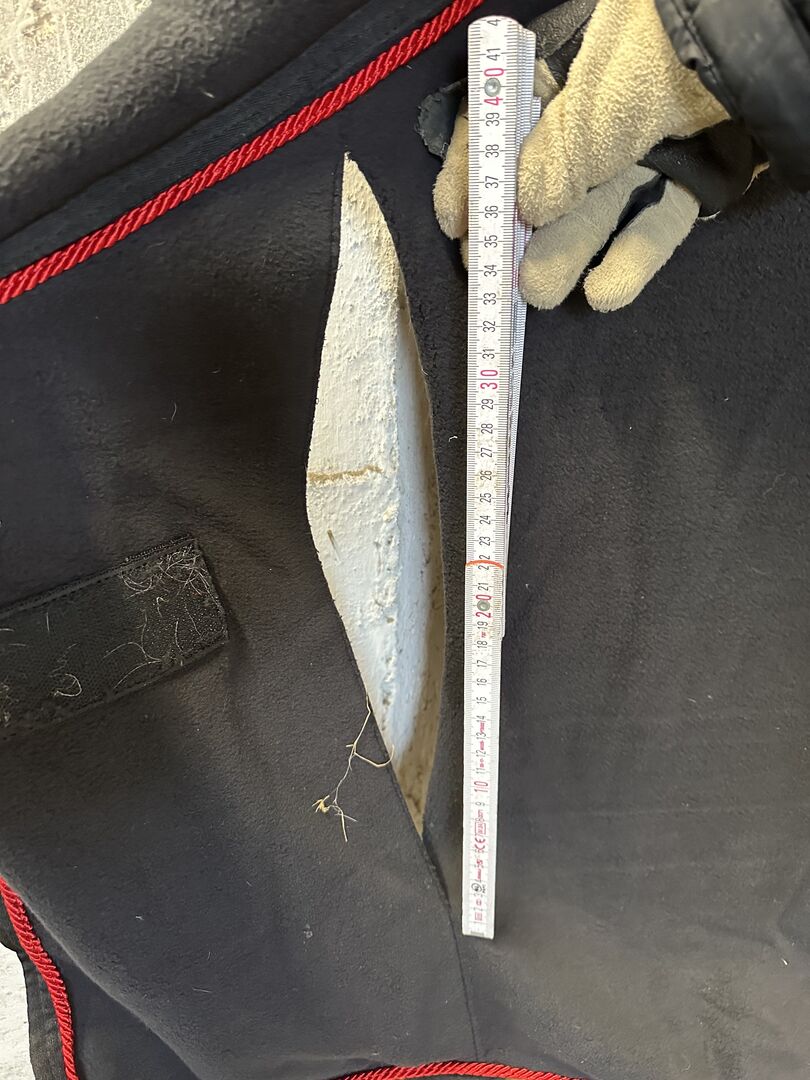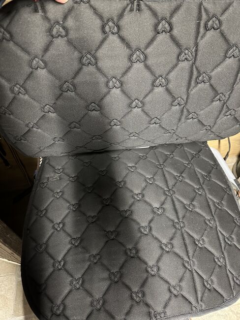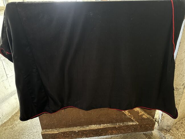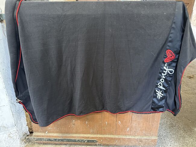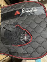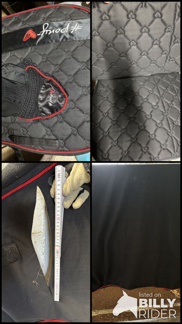 Ponylove USG Lia and Alfi Set black-red - The saddle pad is DL and the fly hood is full. The sweat rug is size 145cm and has 1 larger tear, see photo. Otherwise in good condition, see photos.