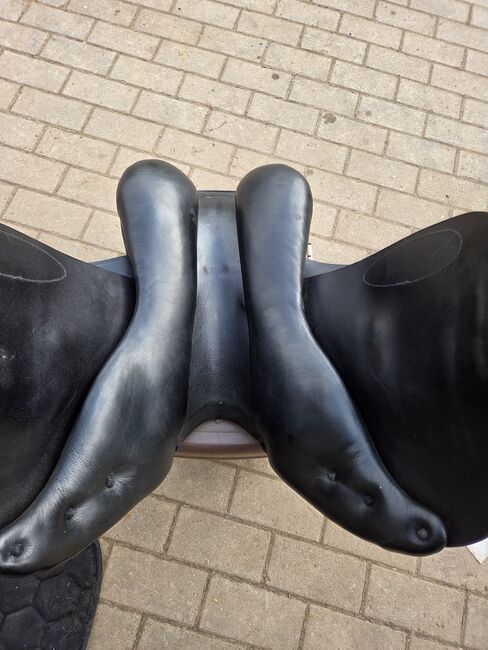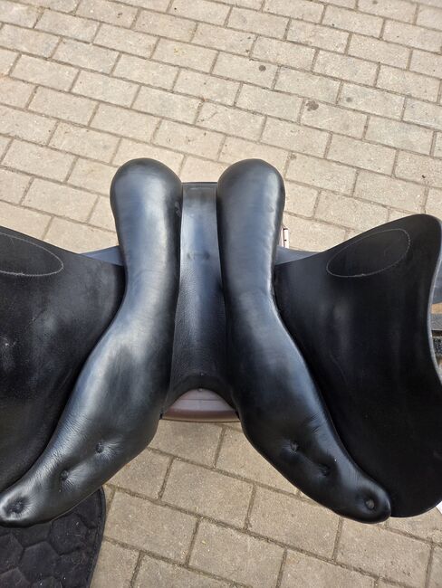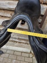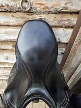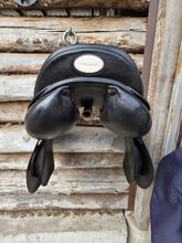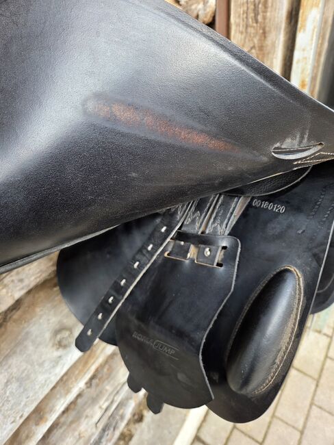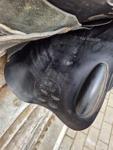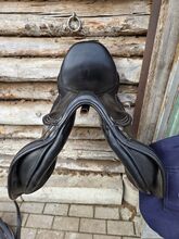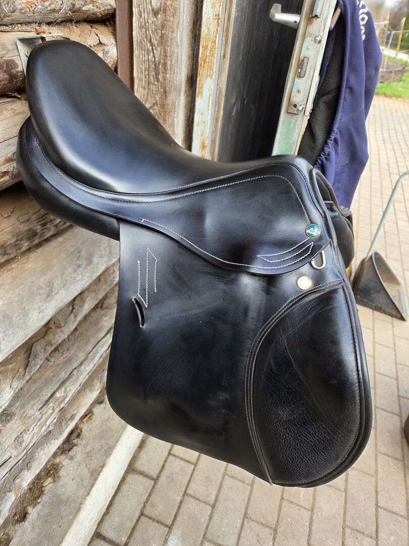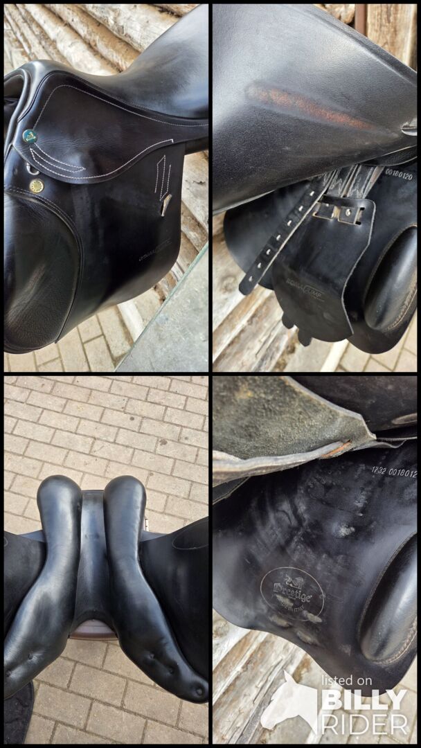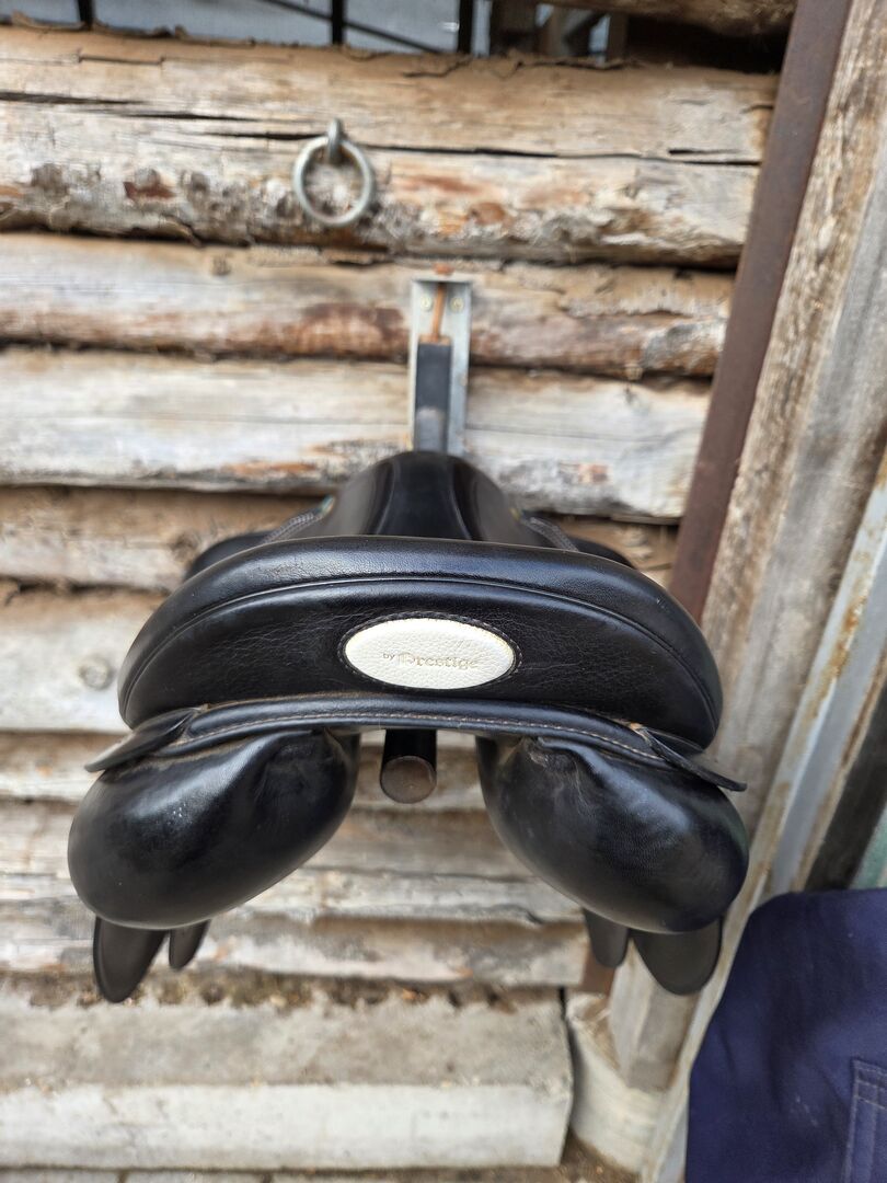 Prestige jumping saddle - Used jumping saddle by Prestige with 32 mm chamber, saddle was used with pleasure, has normal signs of wear, white decorative stitching.