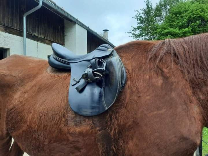 The saddle is older and has signs of use commensurate with its age. 17.5 inches. It was padded by the saddler last year and is very comfortable. He was on a 185 cm tall warmblood with withers. However, according to the saddler, it could also fit a more round horse without withers, as it has a wide chamber.