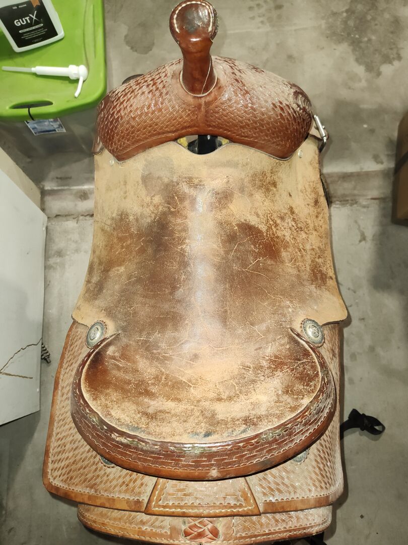 Very nice, great condition, very comfortable 16" Ranch Cutter, semi quarter bars, square skirt, medium oil. Reason for selling is headed in a different direction. Back cinch included.