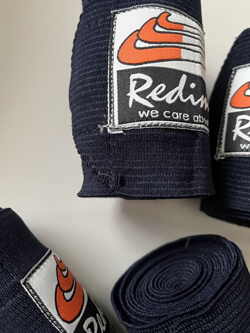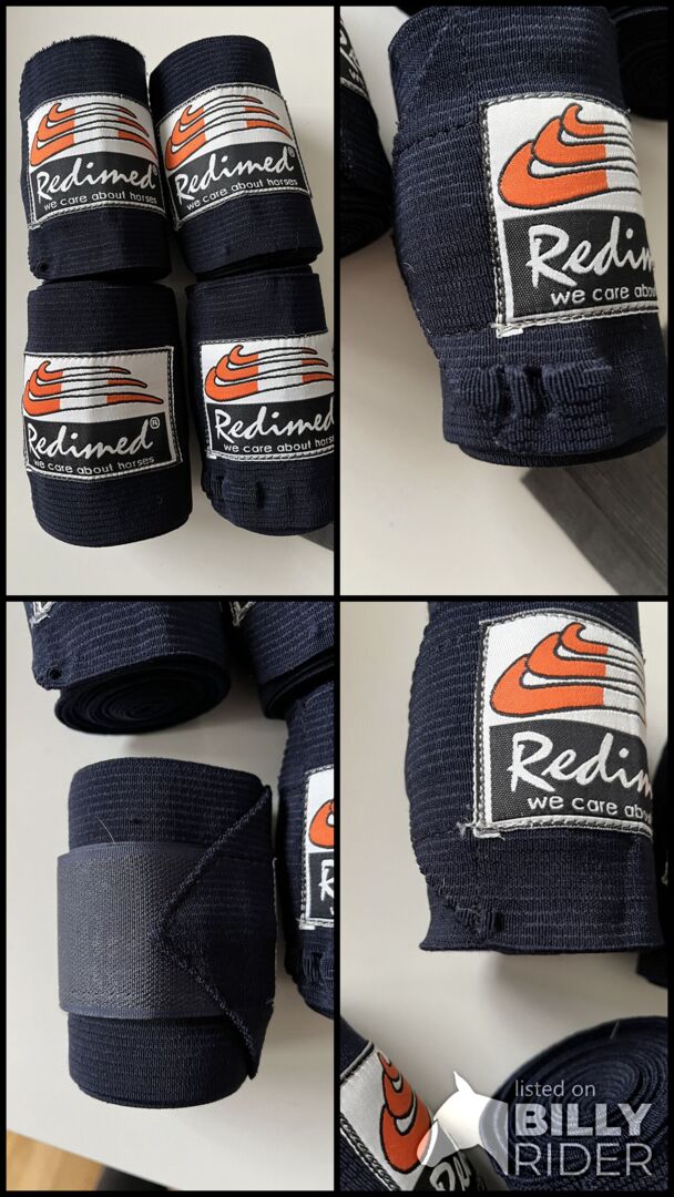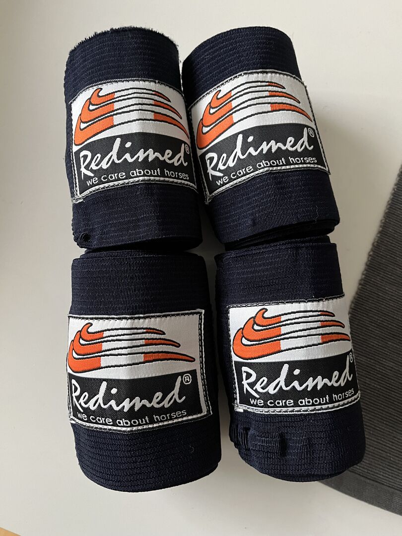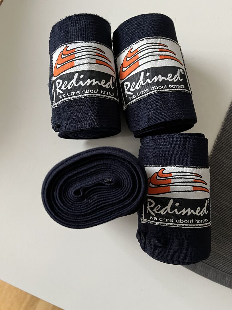 Gut erhaltenes Set aus 4 elastischen Redimed Bandagen in dunkelblau. An manchen Stellen ein paar Gebrauchsspuren am Gummi (siehe Fotos). Von weitem aber nicht sichtbar und beeinflusst die Benutzung nicht.