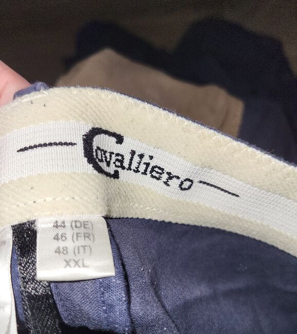 Riding breeches with full leather seat - I am selling used ladies breeches by Cavalliero in size 44, dark blue with beige knee leather trim. They have a Velcro fastener on the leg. The pants have some signs of wear but are without holes etc...e.g. for stable work but still good to use and otherwise fully functional.