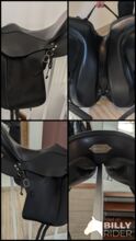 Saddle data Saddle type: dressage - trail riding saddle, year of manufacture 2008 Leather: black Seat length: 18'' Seat height: 3,5'' Seat width: 12'' Seat design: smooth leather softseat Skirt shape: molded upholstery Side panel: straight Upper cushion: thin, soft Lower pommel: wedge-shaped Upholstery: molded upholstery with shoulder guide Girth type: 2-strip with V-buckle Fittings: Stainless steel Other: Leather buttons for stirrup suspension