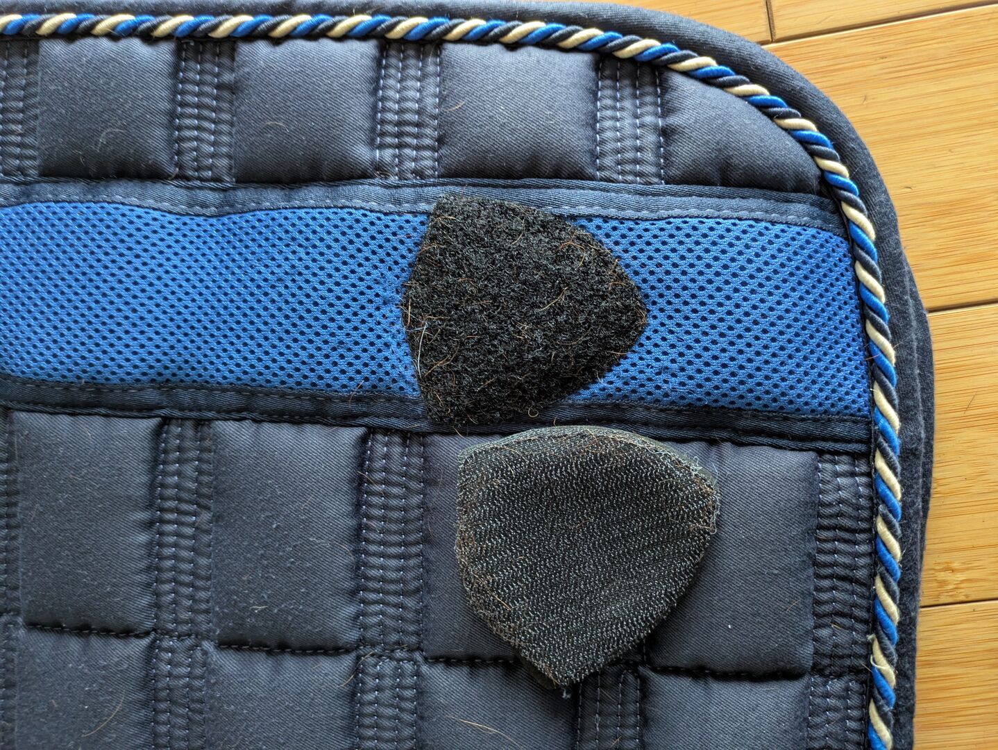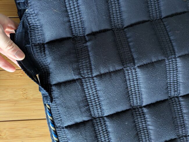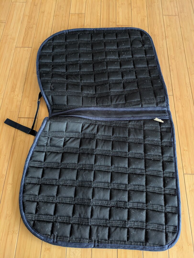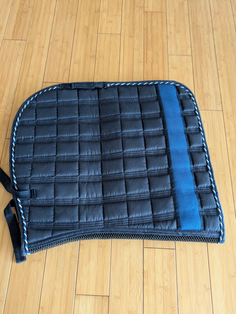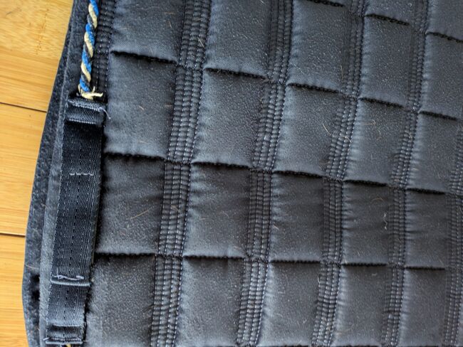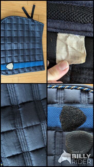 Saddle pad covalliero blue DR WB full - It has slight pilling on the saddle area (last two photos) Otherwise it has been freshly washed and is in very good condition. There is some fluff inside and the hair didn't come off completely during washing, but as I said, they are clean.