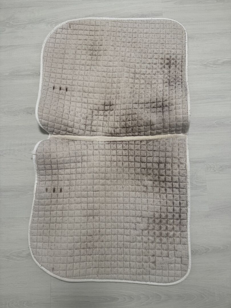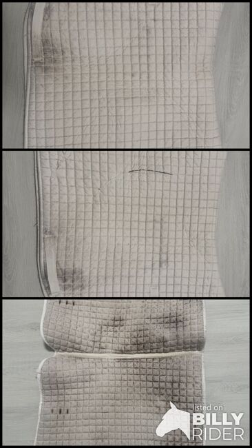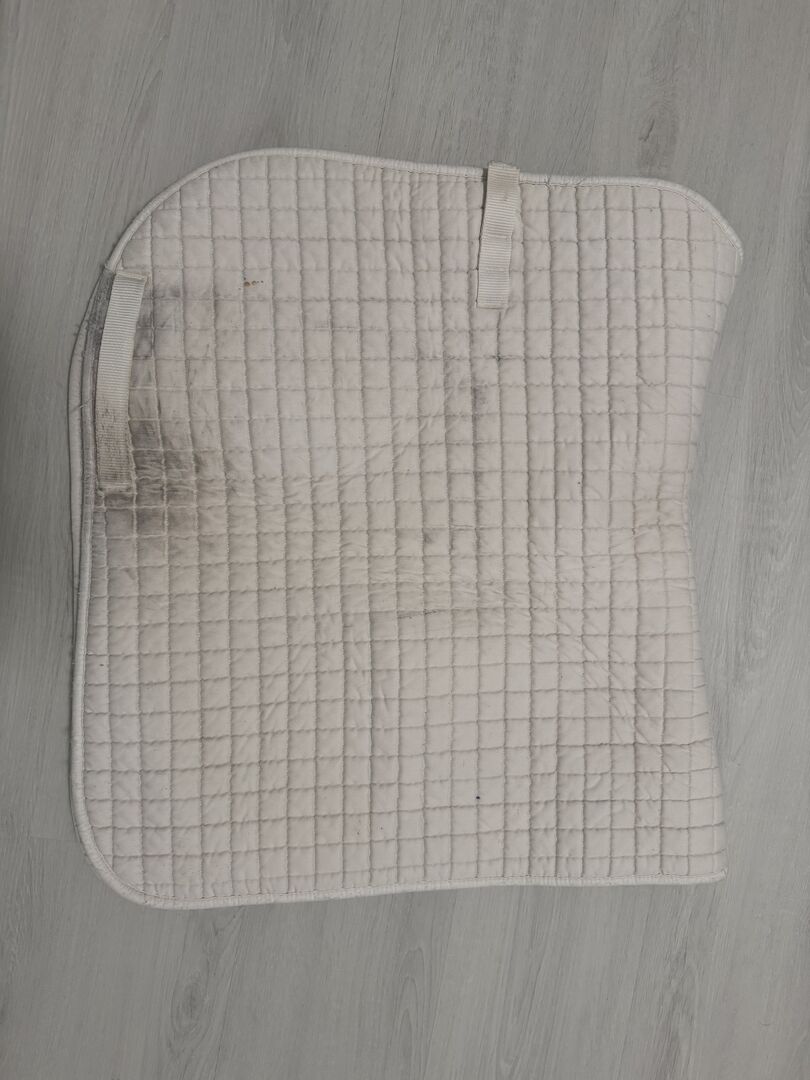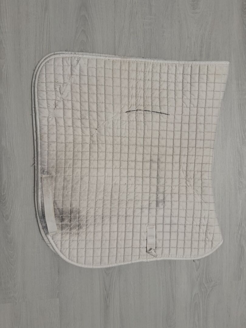 Saddle Pad Dressage - Dressage saddle pad. White with traces of use from the saddle. Great for mono flaps as the strings for the saddle flap have been cut off. But does not restrict use. Private sale therefore no guarantee or return. Shipping possible for a fee.