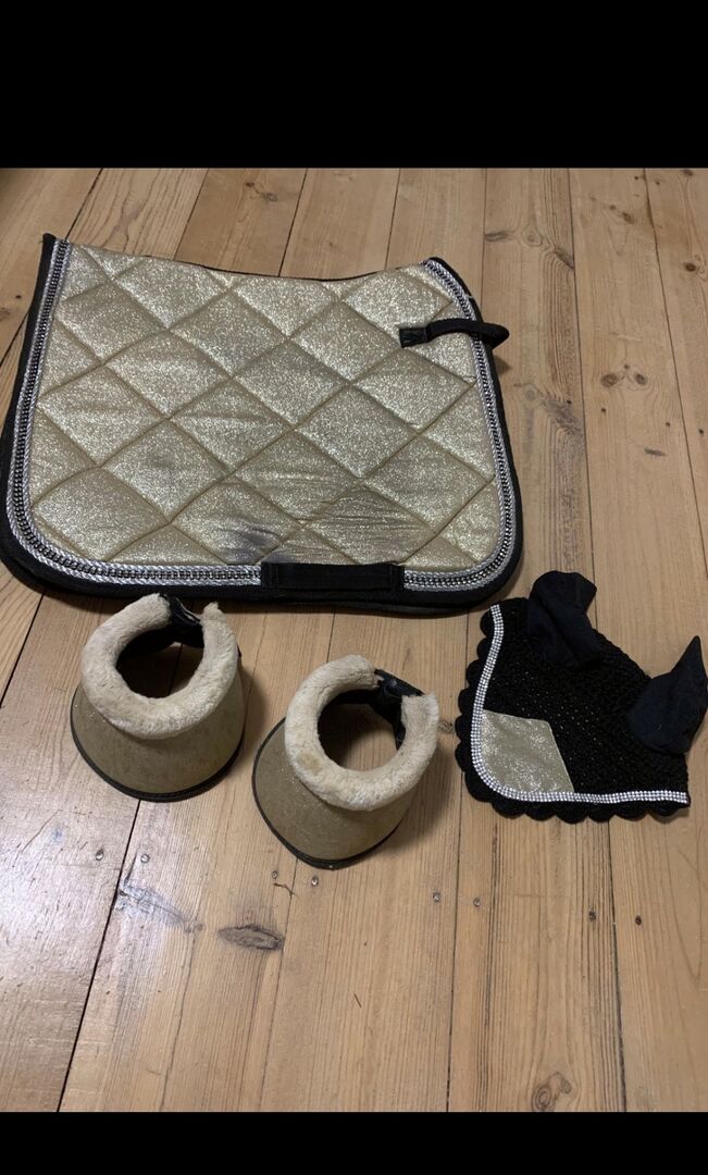 Saddle pad set gold - Sell here a well-preserved saddle pad set - saddle pad - hoof bells- fly hood.