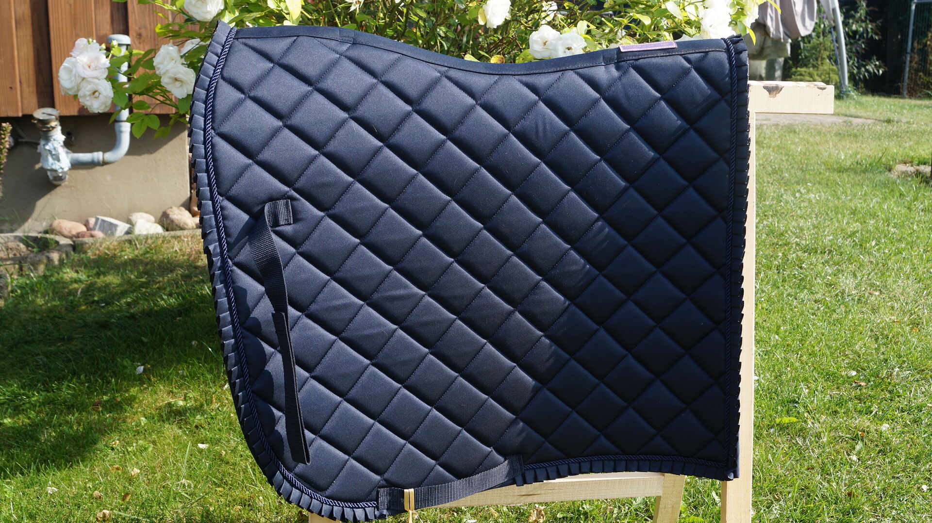 I am selling this unused saddle pad in blue with decoration. It has a slight rise at the withers.