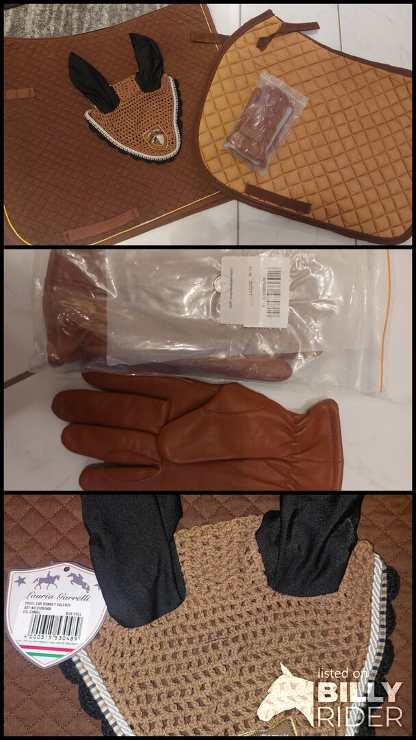 Set! 2 saddle pads, gloves, fly hood in brown - Dressage saddle pad Full dark brown with golden decorative cord. VS saddle pad, fly hood from Lauria Garrelli Leather gloves brown size S (fits size 8) Also available with matching brown bandages.