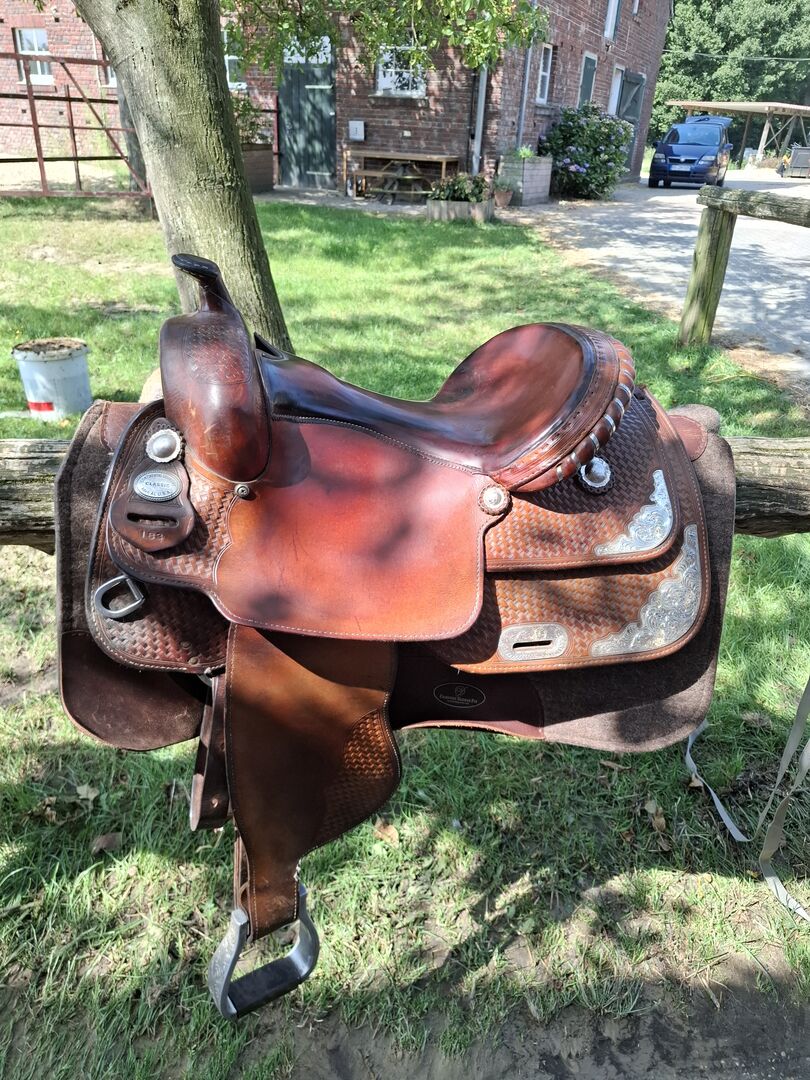 This original Classic No.183 made in Wyoming offers everything a rider's heart desires! This saddle is a dream for every discipline, whether for work on the arena or for extended trail rides, it offers its rider a comfortable and secure seat. As it is a show saddle, it has hallmarked silver fittings and conchos that do not tarnish.