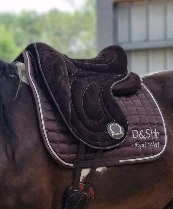 For sale is a like-new SIGNUM riding pad in size M with an attractive brown suede look. The pad features an adjustable gullet width, allowing for a customized fit to your horse. As always with Signum, it stands for quality and comfort. It was only adjusted and briefly tried on, but unfortunately, it's too large for my daughter. The pad has been properly stored and is in excellent condition.
