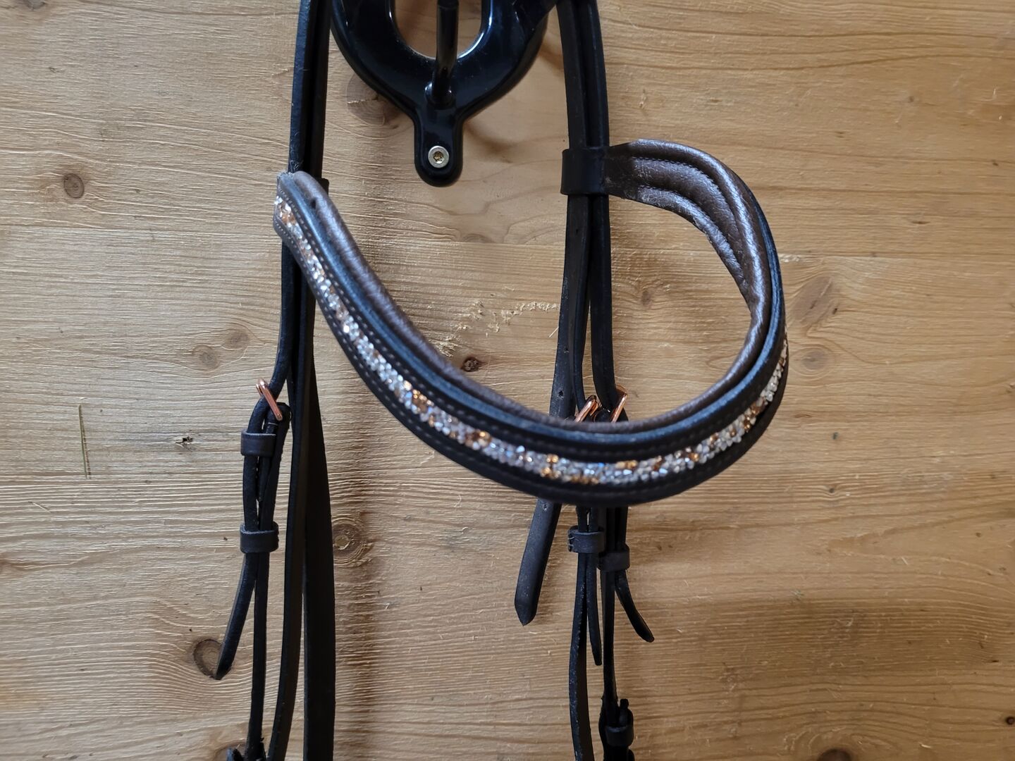 Snaffle bridle - Snaffle with English combined noseband and sparkling browband set with tiny rose gold/silver colored stones. Underpinned with soft leather padding. Rose gold colored fittings. With reins without bit!!! Private sale no guarantee and no return!!!
