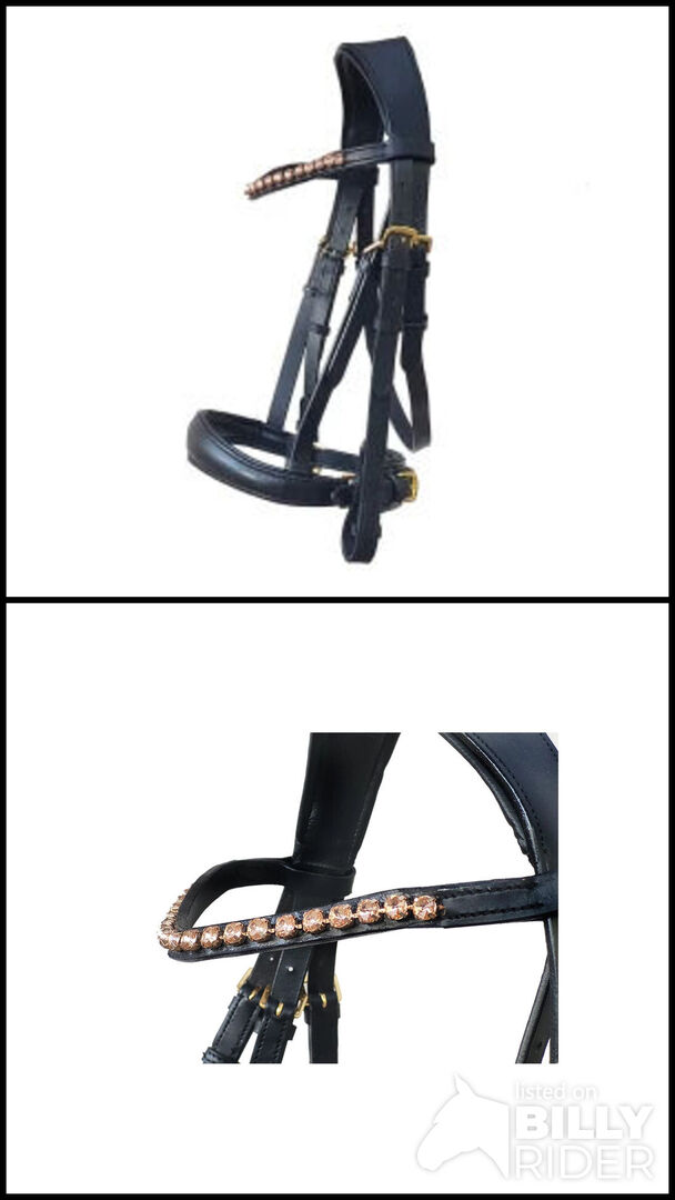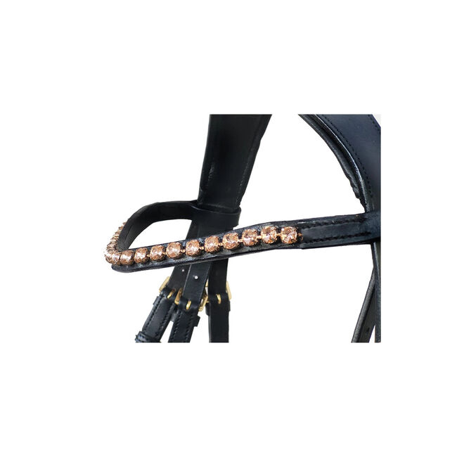 Snaffle bridle "Brianna" detachable locking strap size Full - "Brianna" snaffle bridle with detachable locking strap made of leather with detachable locking strap glittering rhinestone browband in subtle to bold rose gold tones slightly curved browband brass-colored fittings Swedish noseband anatomically shaped headpiece lined on nose and poll incl. web reins