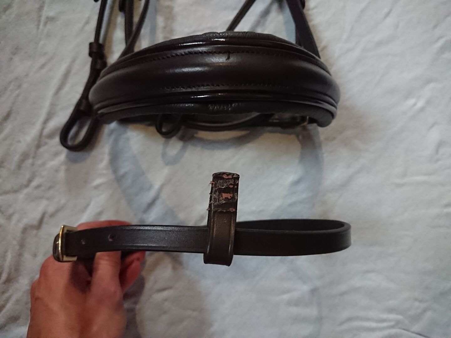 Snaffle bridle Horze Brown full as new - English snaffle bridle, combined, loop was detached but is included and can be sewn back on proplemlos. Beautiful chocolate brown with gold colored fittings. Crystals on the browband, super soft leather. At the neck anatomical, softly underlaid, the softly underlaid noseband is very wide, which I do not like on my horse. The noseband is adjustable on both sides, firmly sewn to the side of the neck piece, therefore not so easily replaceable. Otherwise a nice bridle in super condition, reins still unused. Size Full Warmblood, falls out normally.