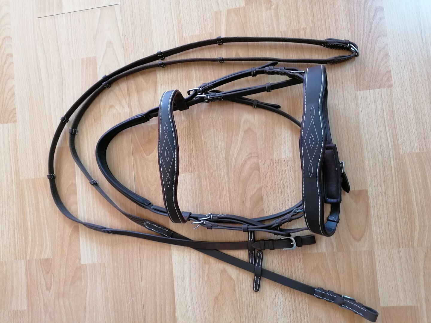 Snaffle dark brown - Snaffle dark brown with white decorative stitching, size WB, incl. matching web reins