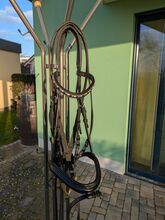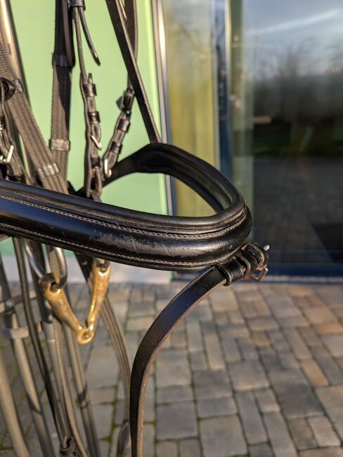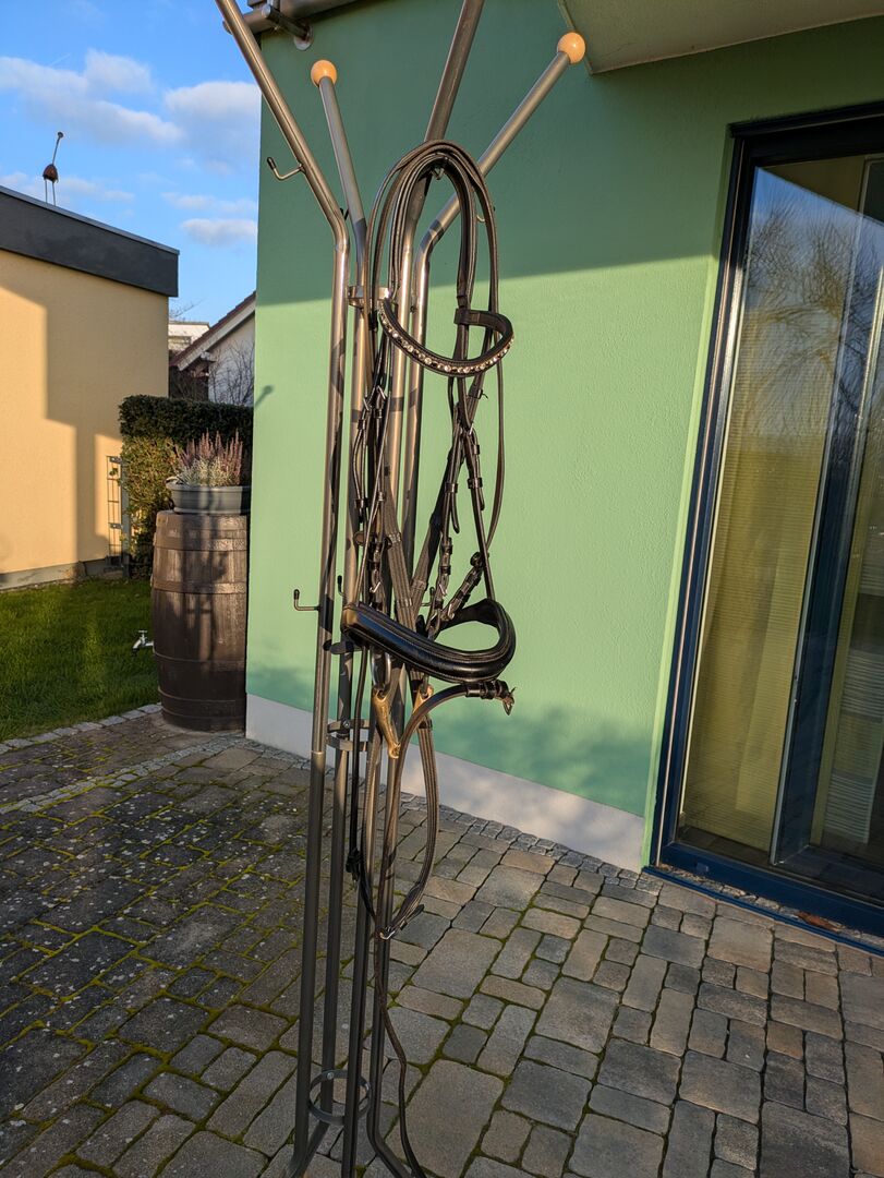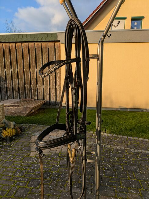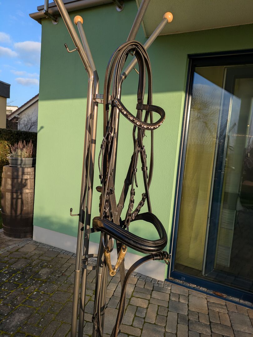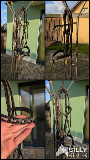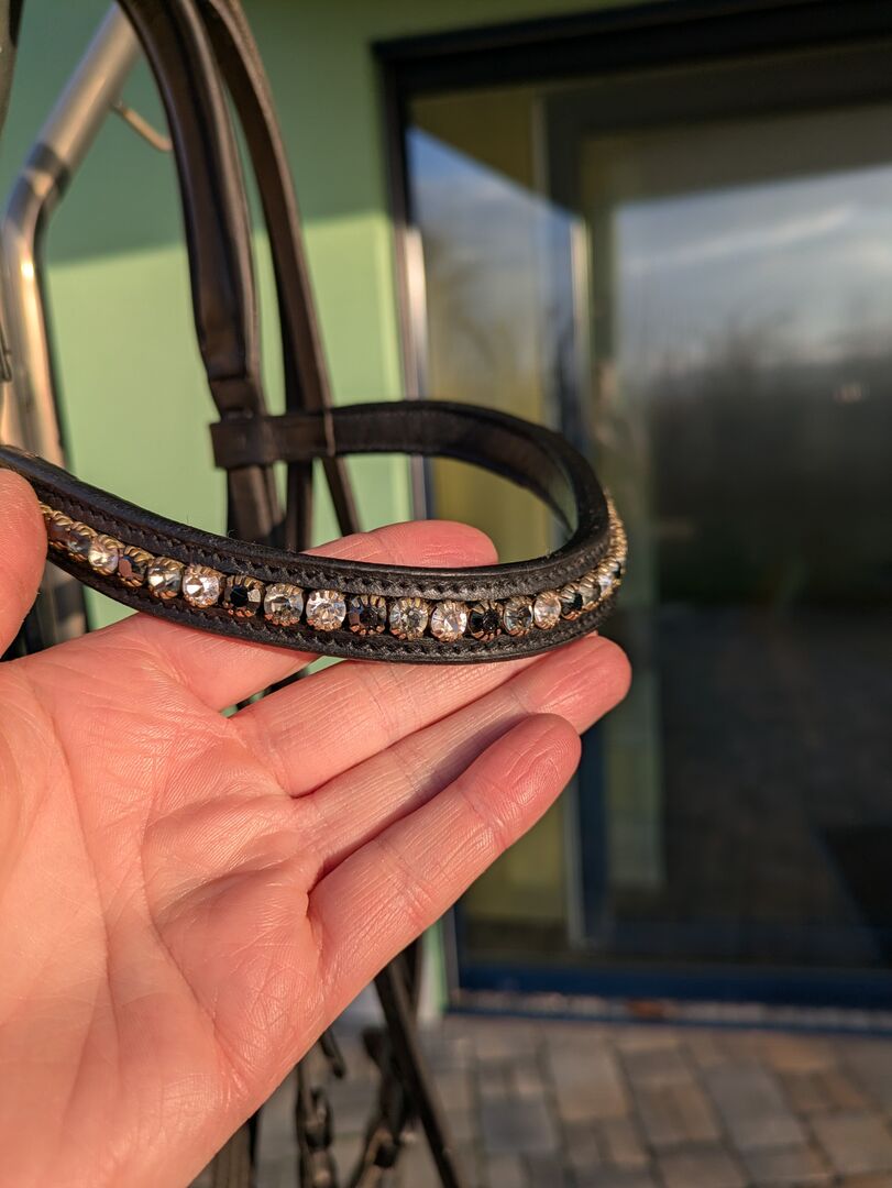 Snaffle with bit - For sale beautiful snaffle with single broken bit. Curved browband with silver, gray and black rhinestones. Bit from HS Sprenger 15cm