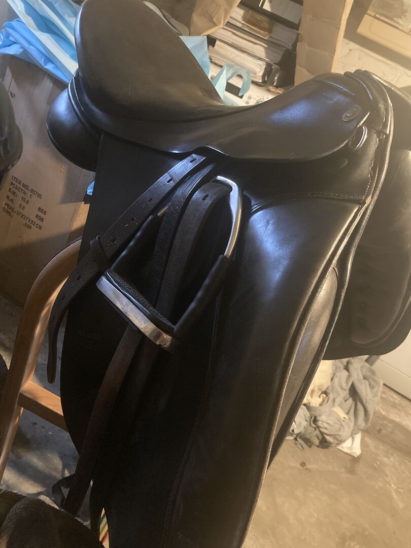 Seat: 18 inch Saddle flap: normal Chamber width: 32 (infinitely variable cold adjustment) Color: black Cushion filling: wool Condition: good, used condition Leather: durable cowhide Fit: fits well on slightly curved horse backs with medium-high withers Pommel: medium sized Seat: deep