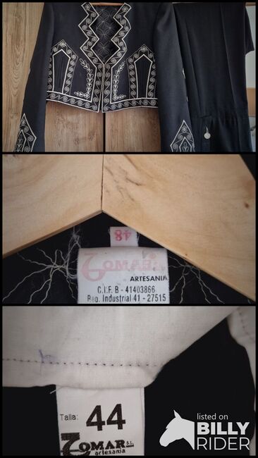 Spanish riding costume - Sell my Spanish riding bolero, the bolero is in top condition! It was worn 1x at a show and 1x at a shooting.BOLERO in black with silver. There are Spanish sizes in the pictures The bolero should have 38/40, it fits me exactly. If you are interested just contact me. Spanish pants are already sold.