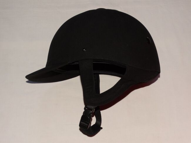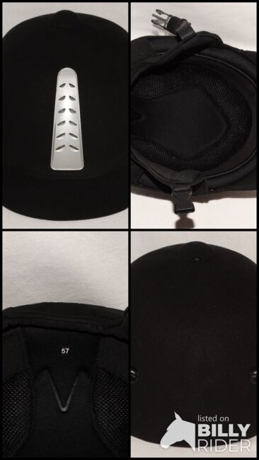 Sporty velvet riding helmet size 57 KNIGHTSBRIDGE AIR black Riding helmet without accident - Rarely used and accident-free, sporty riding helmet for sale. KNIGHTSBRIDGE (but it is no longer written on it). - Model: Air - Size: 57 - Impact-resistant ABS outer shell made of microfiber velvet - Shock-absorbing EPS inner shell - Optimum air circulation at the front and back - Soft padded chin, neck and side protection to prevent chafing from nylon straps - Inner lining removable and washable Please refer to the pictures for condition, thank you! Bought in 2012 and has been at home in the closet since 2013 as a better fit for my head shape was purchased. But it is still very comfortable, unfortunately I don't have a helmet head and the current one just looks better on me.