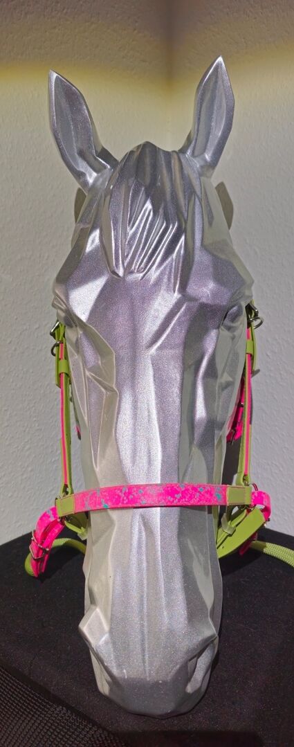 Swap/Sell Biothane Snaffle - Exchange/Sell new unused biothane bitless bridle in the color Holy Guacamole-Magenta-Tükis speckled colorful eye-catcher with stainless steel fittings, size warmblood. incl. premium ppm rope reins 3 M.