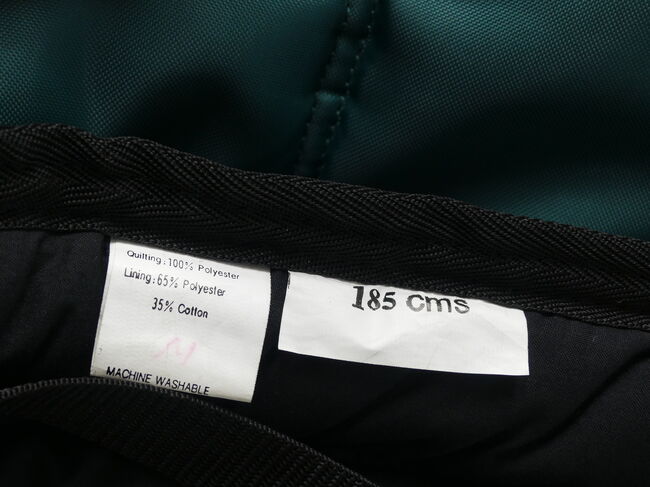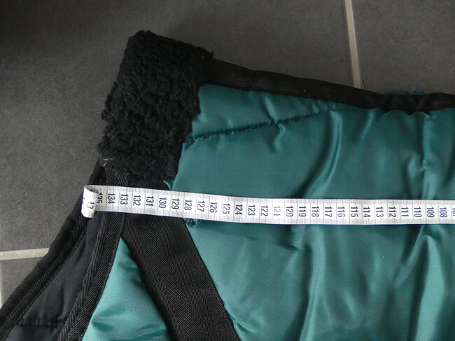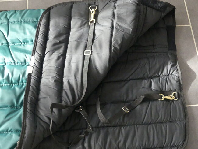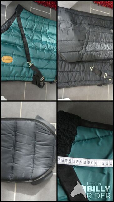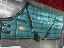 Thermal blanket green 135 cm - I am selling my green thermal winter rug from Thermostar in size 135 cm (back length) total length 185 cm. The blanket is in mint condition as it has never been used. One fastener s. Picture is a little flaked off. The blanket can be washed in the washing machine and is made of 100% polyester, the filling is 65% polyester and 35% cotton, see also the label on the blanket.