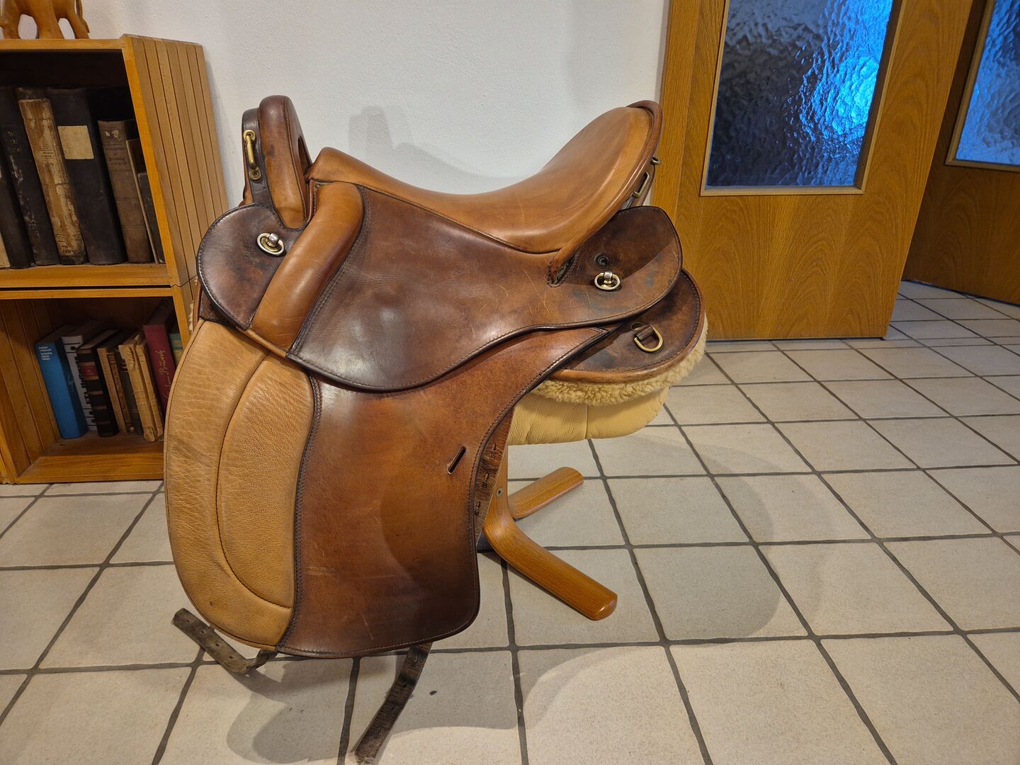 Trail riding saddle Oakfield from Sommer and Way out West - I am offering for sale the mega comfortable trail riding saddle from Sommer and Way out West Oakfield Trekking shown above. Unfortunately I can no longer use the saddle due to a disability. Otherwise I would not sell this great saddle. This model is based on the seat construction of the Sommer Evolution saddle, paired with a large, slightly flexible base. 3-fold adjustable chamber width and two adjustment options for center of gravity and spinal canal width. Saddle panels can be loosened with a screw, no tools required. Slightly flexible, self-padding saddle panels. Genuine lambskin on the underside. The Oakfield is a very comfortable trail riding saddle with modern, adjustable technology. Almost everything can be individually adjusted, from the swing and position of the panels to the knee rolls and gullet width. The tree is slightly flexible with a forged gullet plate. The softly padded contact surfaces are filled with molded foam panels (which can be changed as required using a Velcro fastener), which do not become hard or uneven. These panels adjust themselves to the angle of the horse's back, making them suitable even for very sensitive horses. The fit of the saddle can be easily adjusted to the horse in question using the screws (see photo). The knee rolls can be screwed on at different positions. The saddle can also be ridden without knee rolls and without a saddle flap. There are enough screws and eyelets for luggage. One photo shows a hole. Nothing is missing here, but the saddle can be easily adjusted to the horse by simply moving the screws. I have shortened the stirrups a little as they were far too long. The red on the panels comes from a red felt saddle pad that I used underneath. I had a fur pad over the saddle to protect it and I don't wear silicone breeches, which damage the leather