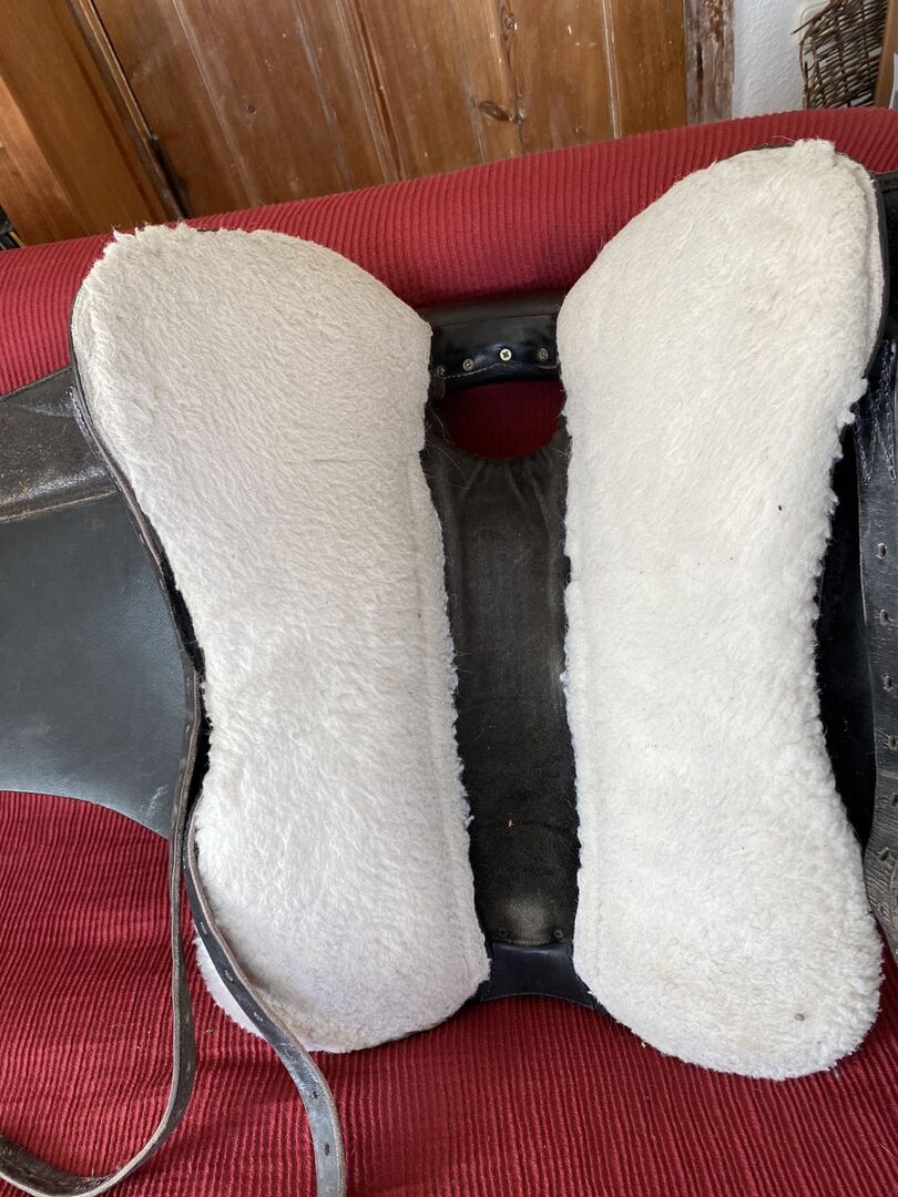 Selling my beautiful Twin light saddle, which was made by Nomad and can be fitted to (almost) any horse. The saddle has a roomy seat. I didn't feel lost even with a size 38. The saddle enables a balanced seat with a relaxed leg drop. On long rides you don't feel cramped and can always vary the riding position a little, which is very comfortable for horse and rider. The saddle weighs just over 6 kg and has a high-quality finish. Good, sturdy leather was used. The gullets are easy to replace yourself if necessary. They are simply looped into the corresponding D-rings. As there are three of these girth rings on each side, the girth can also be adjusted. The stirrup leathers are high-quality snap buckles. The stirrup leathers can be routed over or under the saddle flap. The underside of the saddle is covered with medical pile and the pad can be upholstered. The horse in question was a broad pony, KW approx. 35, with a relatively straight back. The saddle naturally shows signs of wear (which is inevitable when riding on trail or endurance rides), but is in very good overall condition and will continue to serve its purpose for a long time to come.