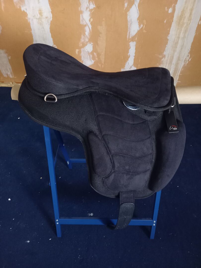 Treeless saddle HKM - treeless black synthetic saddle by HKM size 18 including 60 cm girth and stirrup leathers, as new. Open stirrup strap attachment. Teddy fleece on the underside, inspection possible on site
