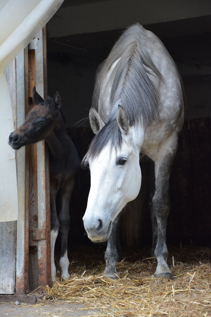 - Warmblood - Arabian - Mix - Dam Nonius Mix, sire Partbred Arabian stallion "Norcal Sierra Snoman" - Born: 27.04.2023 - Harmonious conformation, correct foundation, final height approx. 160 - Very good hooves, goes over stones without problems - Black-brown pinto - can be moldy - Calm, loving temperament, very cuddly and people-oriented, also very playful - Has a successfully treated allergy to mosquitoes (through ASIT immunotherapy)
