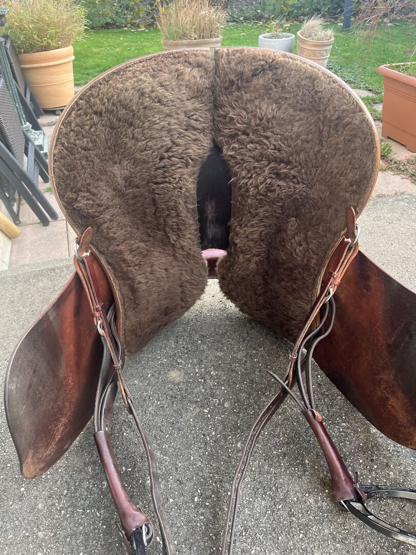 Dressage seat with long saddle flap. Roundskirt with sheepskin. Length 63 cm. Flexible saddle tree with slight curve. Medium fork, no horn.