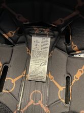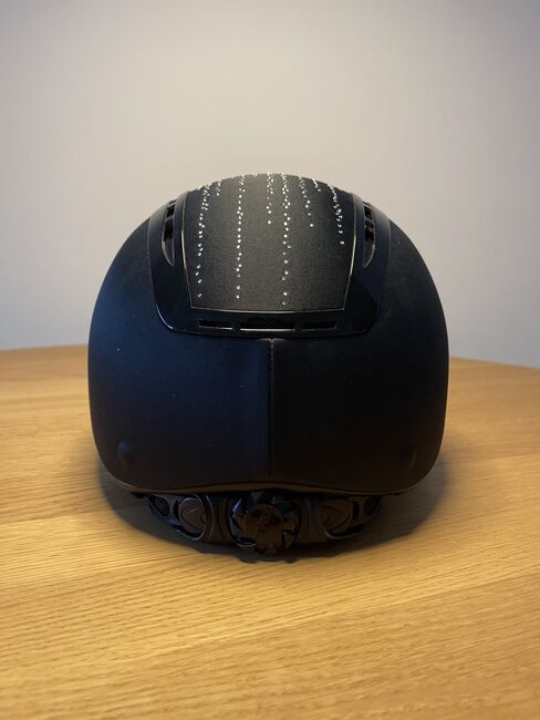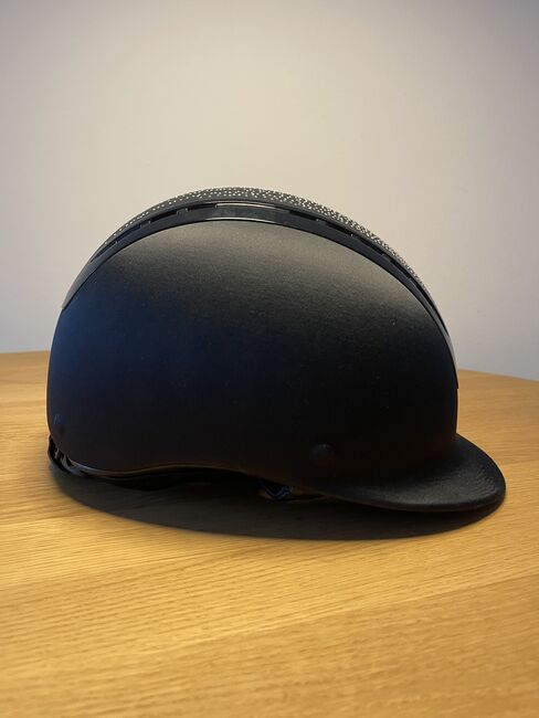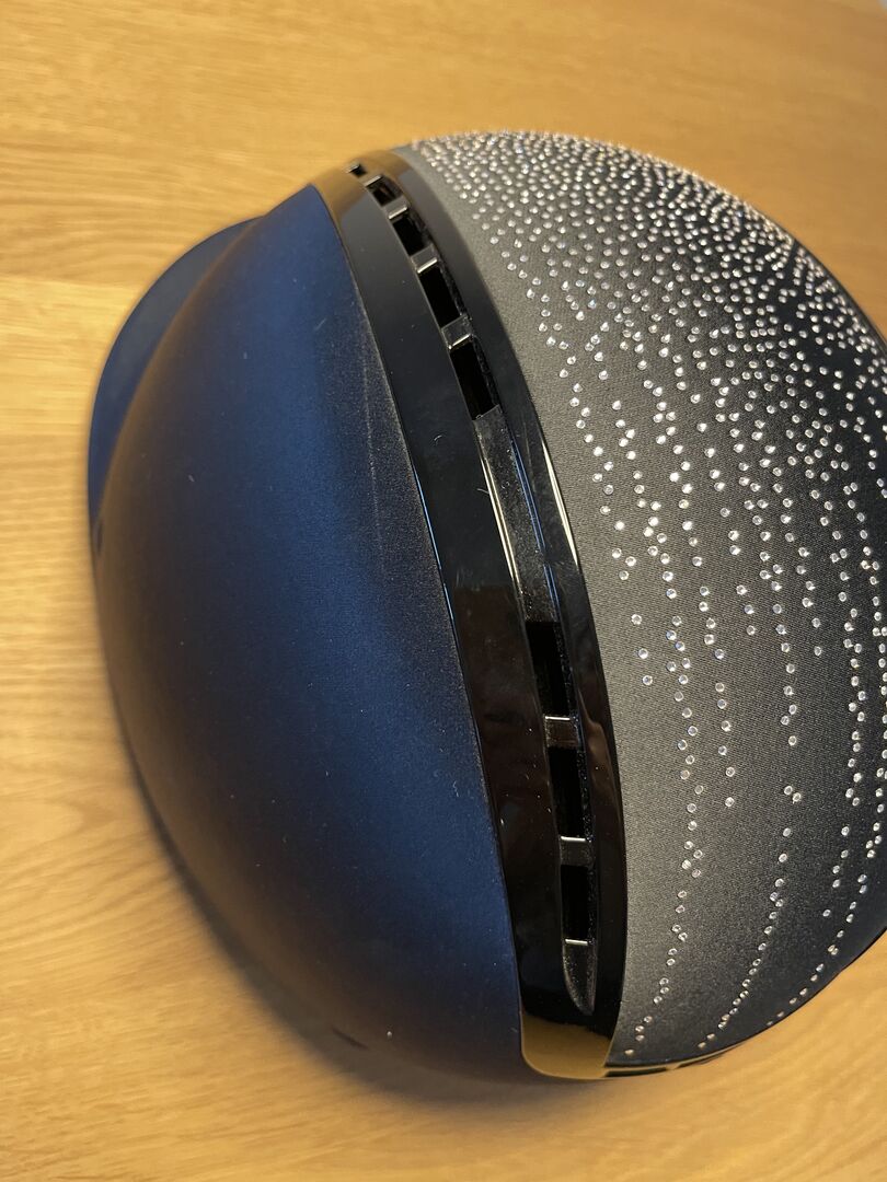 Worn Uvex riding helmet suxxeed juwel in black. Helmet has not had a fall. All stones present, has always been treated with care. Has a slight scratch on the top left, which is hardly noticeable (see picture 3). The inlay needs to be replaced, unfortunately the forehead pad broke during washing. Can be found online for 25€. With dust bag. NP was 649€.