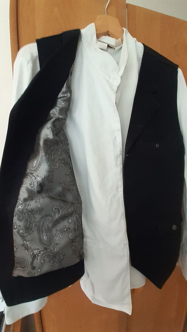 Vest USA dark blue with silver button Working Wear//Show - Durable, chic little worn with silver paisley lining size 38/40 for stable, rider or show day rich dark blue WHITE OLDSTYLE shirt goes for + 15€ with it authentic wear used condition beautiful sleeves in size 38 tie ribbon and OldStyle suitable NP I think about 45$ ... Here 30€ VB Schnapper Further information on request ...