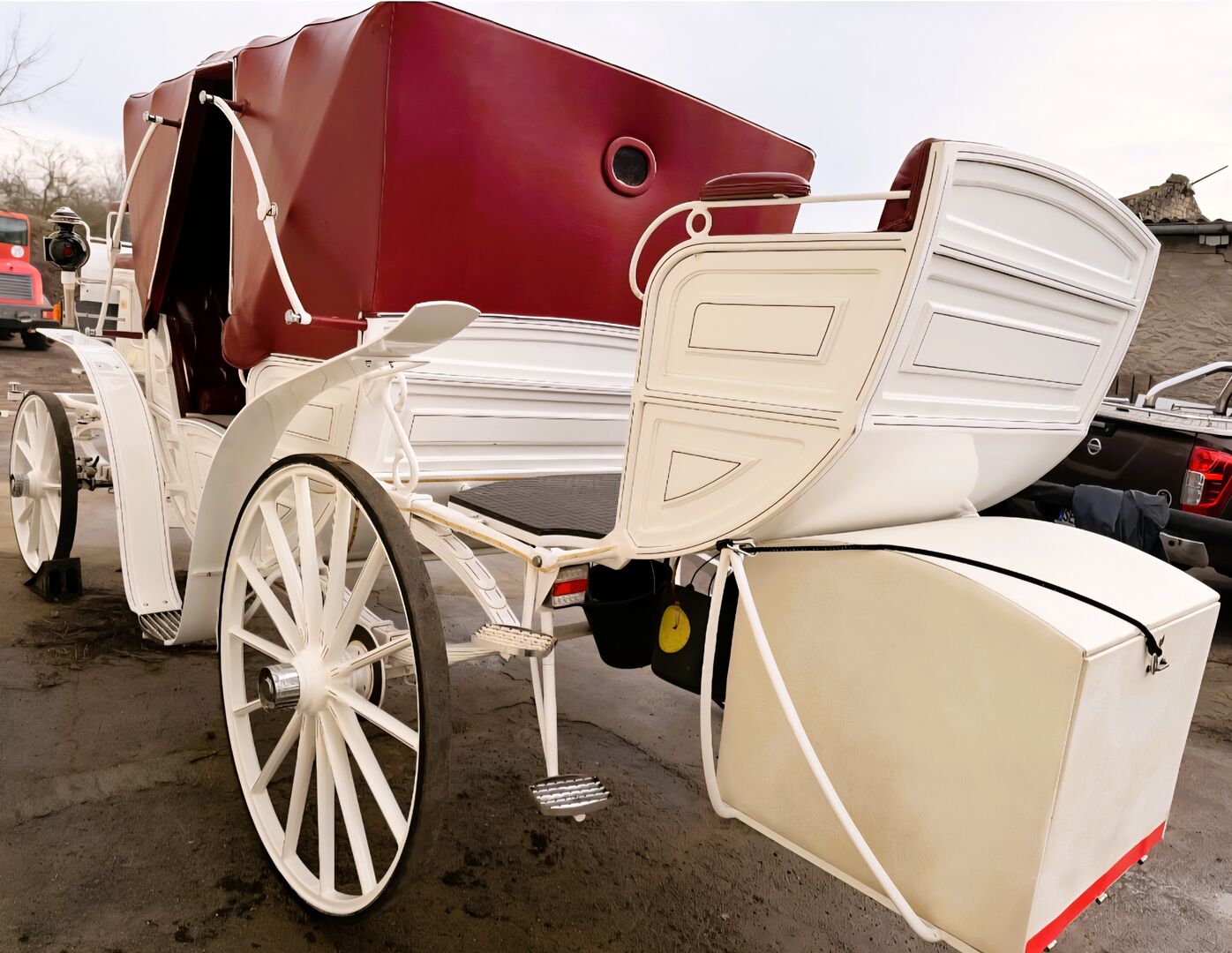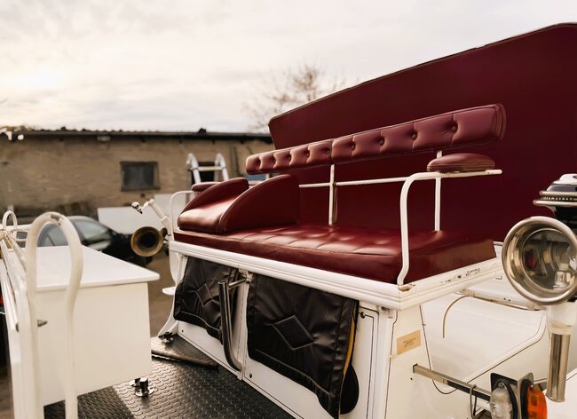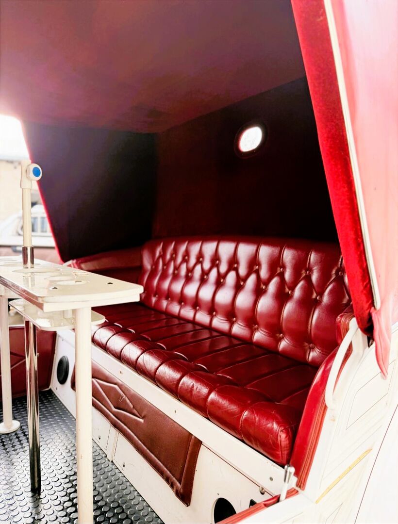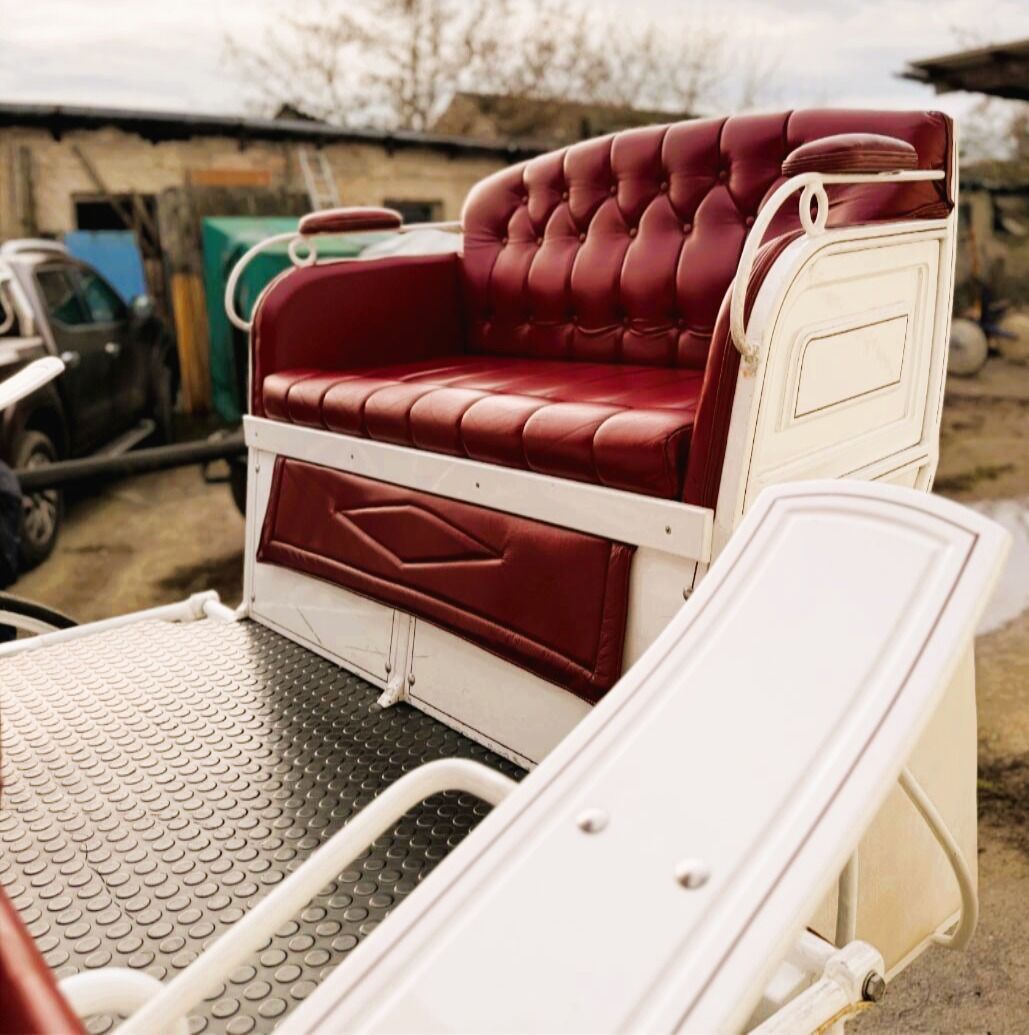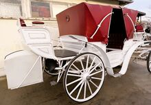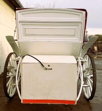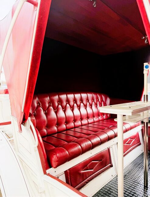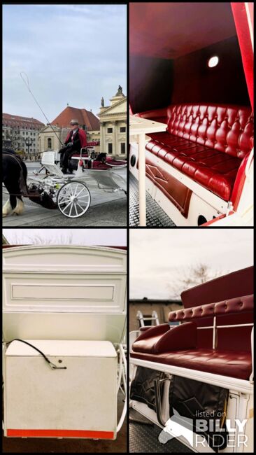 Vis a Vis carriage / special design - Description: Vis a Vis / custom-made Space for 11 people incl. driver with extra groom seat for 3 people in the back. It has 4 disk brakes, crank brakes and street lighting. Track width 2 m, length approx. 6.50 m, solid rubber wheels. There is an additional box for the driver at the front. Horse type: Large horses Type of team: Up to 4-horse team Condition: Used / very good Ready to drive: Yes, carriage is fully roadworthy and drives without any problems Color: White with soft top and seats in genuine leather / Bordeaux red Scope of delivery: See pictures There is enough storage space for blankets, feed or a tarpaulin in the rear case. There is also additional storage space under the benches.