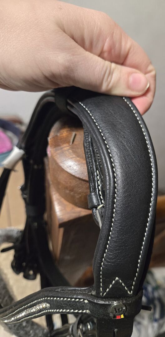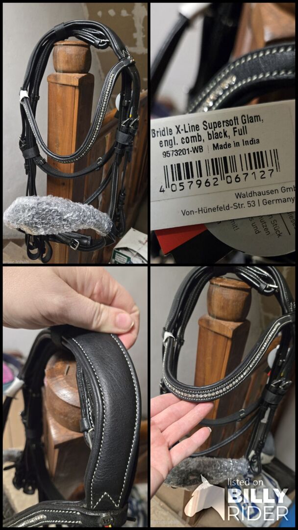 Waldhausen snaffle bridle X-Line Supersoft Glam New - For sale new Waldhausen snaffle bridle X-Line Supersoft Glam in black leather with white decorative stitching and curved rhinestone browband. Was bought as a replacement snaffle, but was never used. Size WB. With shipping 6,99 Euro will be added.