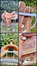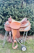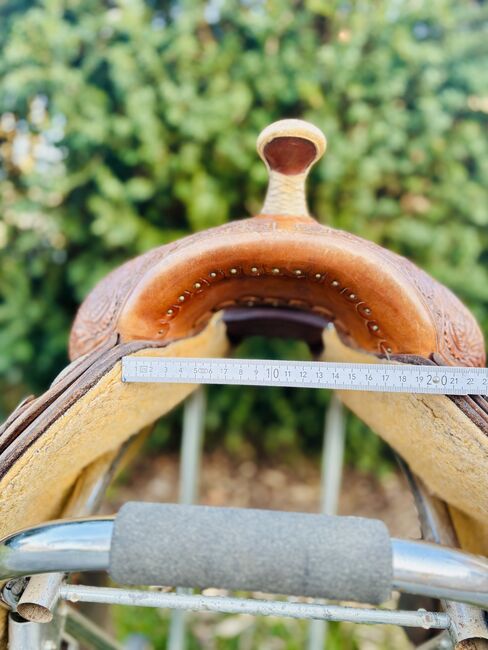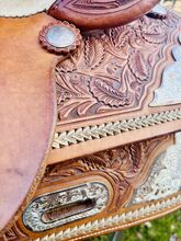 Western saddle Show saddle - For sale here is a beautiful western saddle with Oak Leaf pattern, light-colored seat surface, rich hallmarking, rawhide applications and rawhide stirrups. A real gem and an absolute eye-catcher.