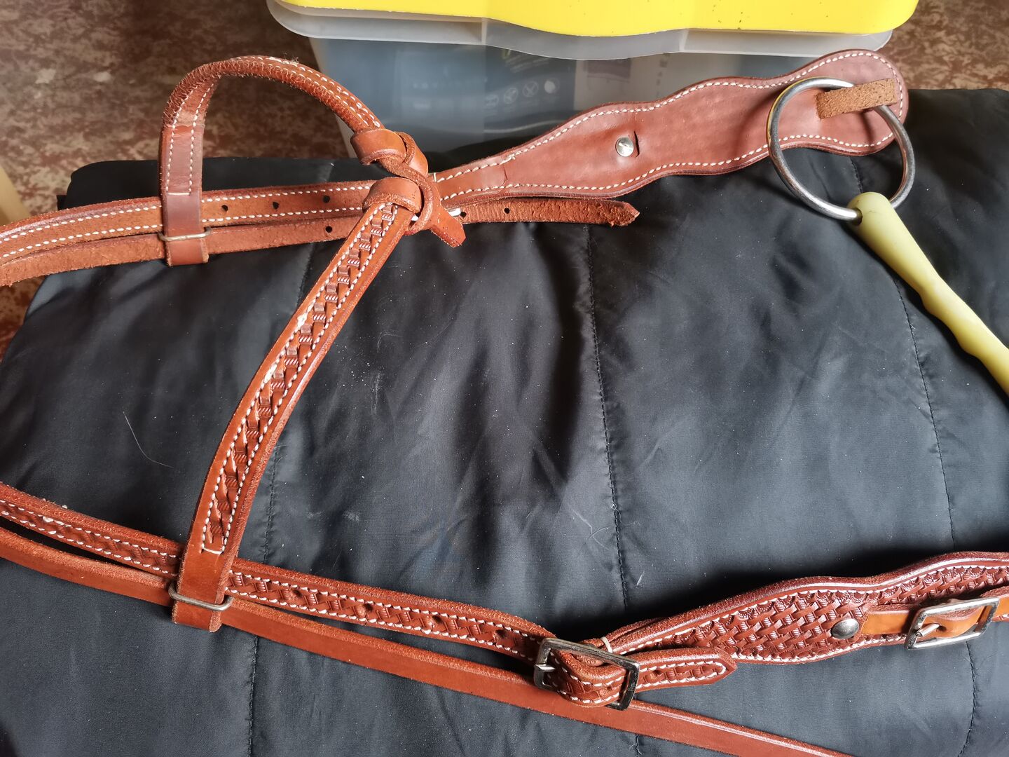 Western Snaffle - WB / Full - Brown Basket - Offer a hardly used and therefore like new western snaffle / headstall. > Western Imports > Western snaffle California Style > Basket stamping > Knitted / knotted browband > Fastening bit by means of screw > Size WB / Full > Material harness leather > Color natural Largest possible length adjustment from the bit holder on the left - over the neck - to the bit holder on the right: approx. 116 cm
